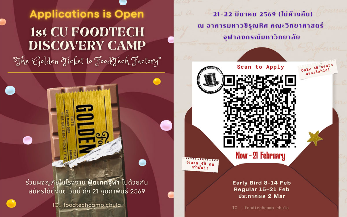 เปิดประตูสู่โรงงานลับแห่งวิทยาศาสตร์อาหาร ให้น้อง ๆ มัธยมปลายที่สนใจ ได้มาสัมผัสประสบการณ์จริง ทั้งการเรียนรู้ ทดลอง และค้นหาตัวเองในโลกของ FoodTech อย่างเต็มรูปแบบ เหมือนได้ลองใช้ชีวิตเป็นนิสิตฟู้ดเทค 2 วันเต็ม! 🍫🎪✨