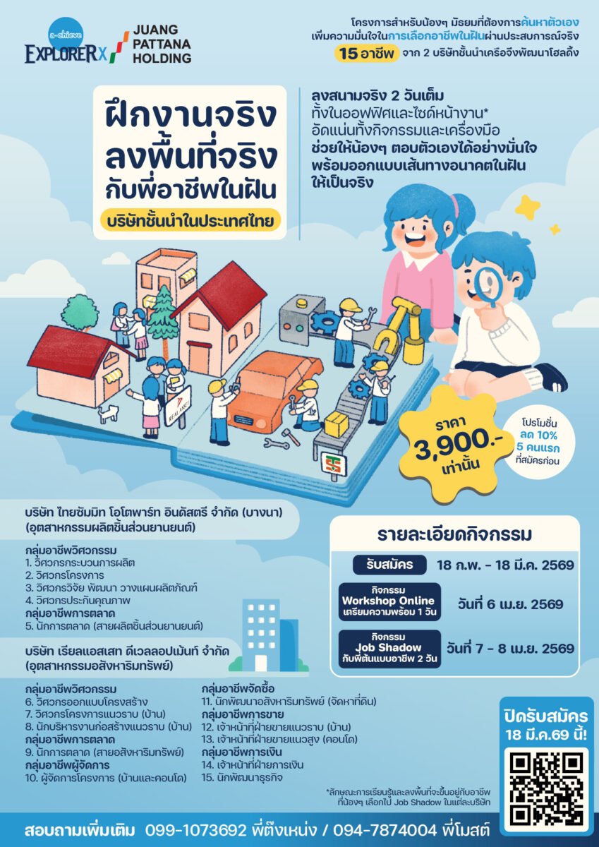 🏭 กิจกรรม Job Shadow กับพี่ต้นแบบอาชีพ 2 วัน วันที่ 7 – 8 เม.ย. 2569 ณ สถานที่จริง