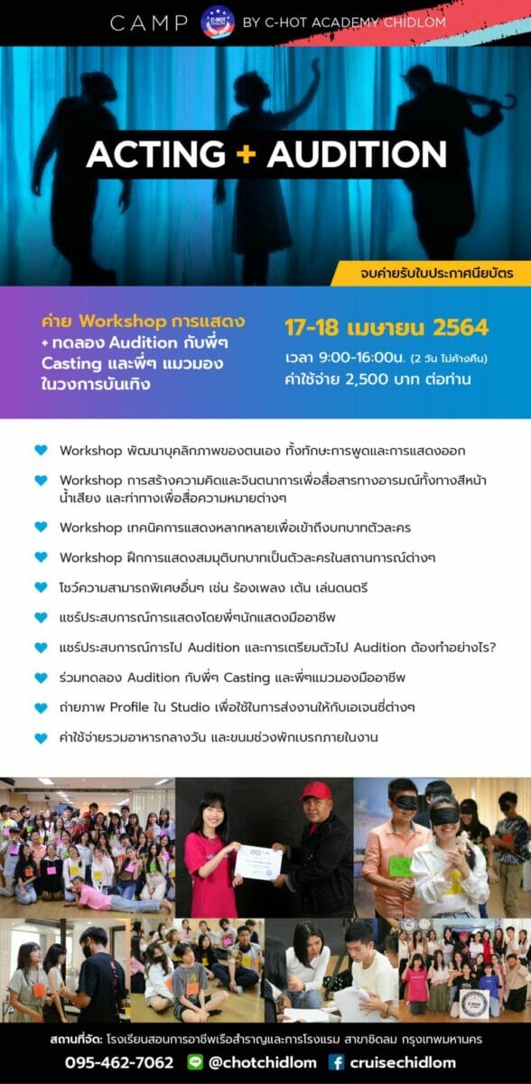 จัดกันอย่างต่อเนื่อง กับค่าย Acting + Audition หลังจาก 3 ค่ายที่ผ่านมากระแสตอบรับดีเกินคาด ที่สำคัญมีน้องๆจากรุ่นที่แล้ว ได้รับเลือกเข้าไป Audition จริงๆ กันหลายคนแล้วนะ!!! ค่ายนี้จะทำให้น้องๆได้สัมผัสประสบการณ์ศิลปะการแสดงรอบด้านกับพี่ๆนักแสดงมืออาชีพ ฝึกทักษะการแสดงขั้นพื้นฐาน ให้น้องๆเข้าถึงบทบาทตัวละคร การสื่อสารอารมณ์ผ่านสีหน้า น้ำเสียง และท่าทางในการแสดงหลากหลายรูปแบบ สามารถต่อยอดทั้งการแสดงภาพยนต์ ละครซีรี่ย์ MV โฆษณา ได้อีกมากมาย งานนี้ไม่มีพื้นฐานการแสดงก็เข้าร่วมได้จ้า