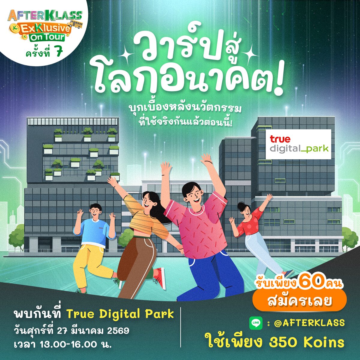 ค่าสมัคร 350 Koins (ค่าเงินจำลองบนเว็บไซต์ AFTERKLASS น้อง ๆ สามารถเข้าไปทำกิจกรรมบนเว็บไซต์เพื่อเก็บ Koins)