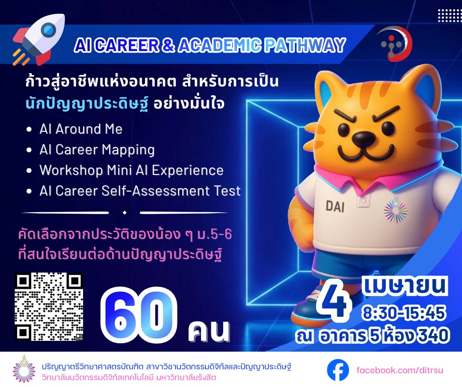 อยากรู้ไหมว่า “AI” จะพาเราไปสู่อาชีพอะไรได้บ้าง? สาขาวิชานวัตกรรมดิจิทัลและปัญญาประดิษฐ์ วิทยาลัยนวัตกรรมดิจิทัลเทคโนโลยี ม.รังสิต ชวนน้อง ๆ ม.5–6 มาร่วมกิจกรรม AI Career & Academic Pathway กิจกรรมที่จะพาไปค้นหาเส้นทางอนาคต สำหรับคนที่สนใจด้าน ปัญญาประดิษฐ์และนวัตกรรมดิจิทัล