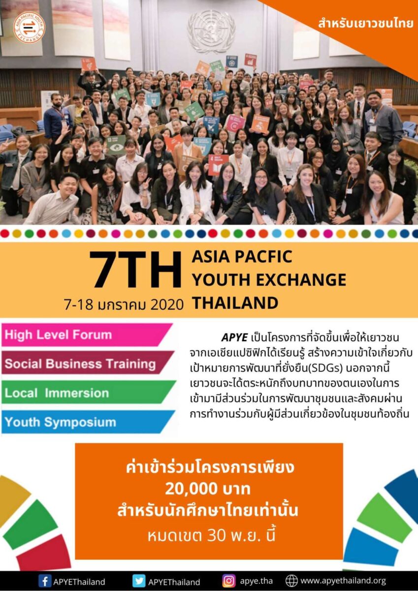 โครงการเยาวชนแลกเปลี่ยนเอเชียแปซิฟิก ครั้งที่ 7 เป็นโครงการระยะเวลา 2 สัปดาห์ จัดขึ้นวันที่ 7-18 มกราคม 2563 เพื่อให้เยาวชนจากเอเชียแปซิฟิกได้แลกเปลี่ยนเรียนรู้ร่วมกัน และสร้างความเข้าใจเกี่ยวกับเป้าหมายการพัฒนาอย่างยั่งยืน (Sustainable Development Goals) เพื่อให้เยาวชนได้ตระหนักถึงบทบาทของตนเองในการมีส่วนร่วมกับการพัฒนาชุมขนและสังคม