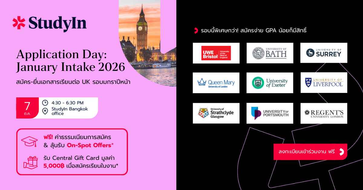 อยากเรียนต่อป.โท UK ต้นปีหน้าไม่ง้อรอบกันยายน ต้องงานนี้เลย กับ Application Day: January Intake 2026 กับเราได้เลย! งานนี้จัดขึ้นเพื่อช่วยให้น้อง ๆ สมัครเรียนและยื่นเอกสารครบทุกขั้นตอนได้ภายในวันเดียว ไม่ต้องเสียเวลาไปทำเองให้วุ่นวาย