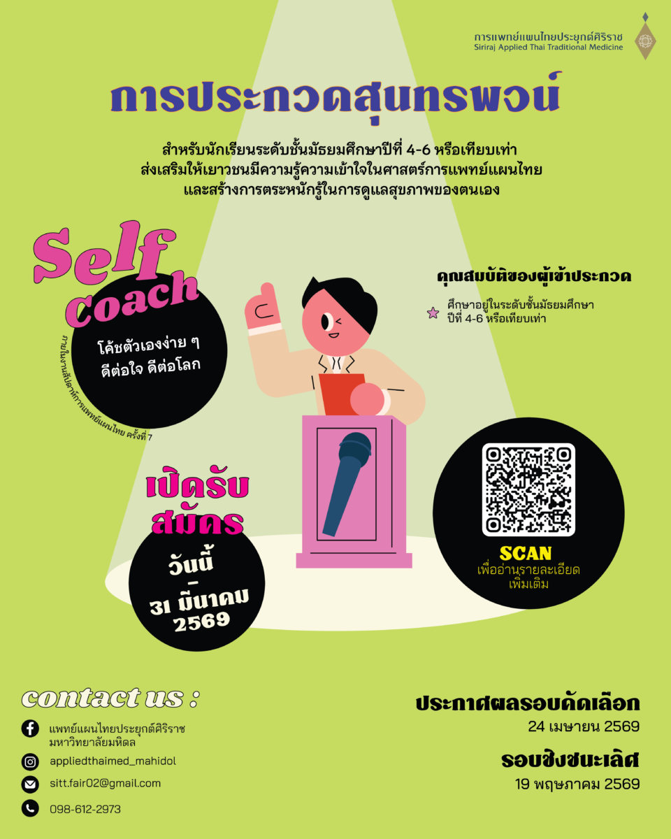 การประกวดสุนทรพจน์ภายใต้กิจกรรม สัปดาห์การแพทย์แผนไทย ครั้งที่ 7 จัดโดย สถานการแพทย์แผนไทยประยุกต์ คณะแพทยศาสตร์ศิริราชพยาบาล มหาวิทยาลัยมหิดล