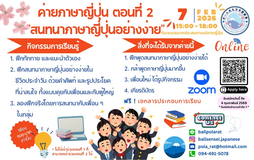 🇯🇵 มาร่วมค่ายภาษาญี่ปุ่นกันเถอะ ‼️ ในค่ายภาษาญี่ปุ่น ตอนที่ 2 “สนทนาภาษาญี่ปุ่นอย่างง่าย” นี้ น้อง ๆ จะได้เรียนรู้ภาษาญี่ปุ่นโดยอาจารย์สอนภาษาญี่ปุ่นที่มีประสบการณ์สอนกว่า 7 ปี ที่เคยใช้ชีวิตอยู่ที่ญี่ปุ่นนานกว่า 6 ปีเช่นกัน 🤩 โดยจะใช้กระบวนการ Active Learning เป็นหลักในการเรียนรู้ร่วมกัน ผ่านโปรแกรม Zoom Meeting โดยตลอด 3 ชั่วโมงนี้ น้อง ๆ จะได้เติมเต็มความรู้อย่างท่วมท้นและสนุกสนานเพลิดเพลินไปด้วยกันอย่างแน่นอน ด้วยงบประมาณที่สุดคุ้ม ⭐️