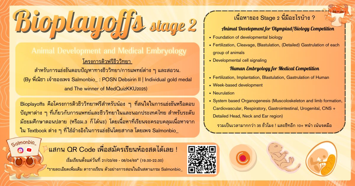 Bioplayoffs คือโครงการติวชีววิทยาฟรีสำหรับน้อง ๆ ที่สนใจในการแข่งขันหรือตอบปัญหาต่าง ๆ ที่เกี่ยวกับการแพทย์และชีววิทยาในและนอกประเทศไทย สำหรับระดับมัธยมศึกษาตอนปลาย (หรือม.3 ก็ได้นะ) โดยเนื้อหาที่เรียนจะครอบคลุมเนื้อหาจากใน Textbook ต่าง ๆ ที่ใช้อ้างอิงในการแข่งขันโดยสากล (ลึกกว่าหลักสูตรแกนกลางไปเยอะอยู่) โดยเพจ Salmonbio_