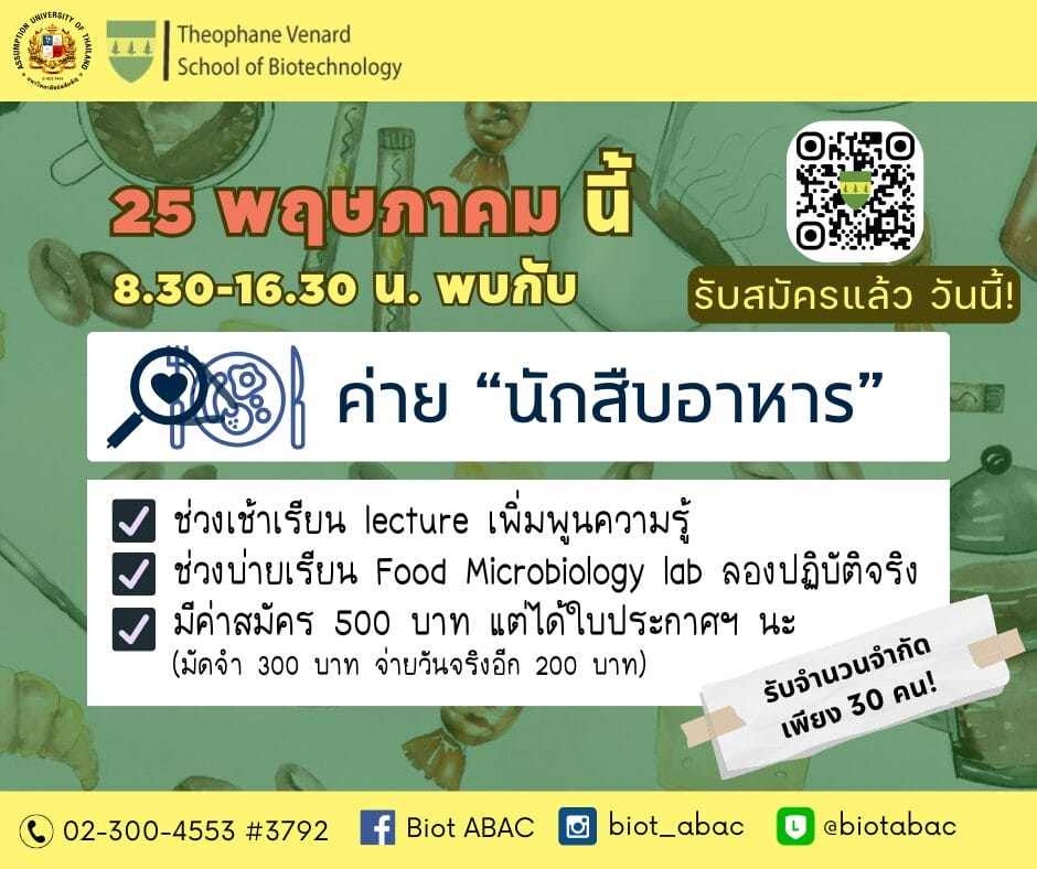 ค่าย “นักสืบอาหาร” จะพาน้องๆ ไปรู้จักโลกของสิ่งมีชีวิตเล็กๆ ที่เรียกว่า รัก เอ้ย ไม่ใช่ สิ่งมีชีวิตเล็กๆ ที่อยู่ในอาหารที่พวกเรากินกันอยู่ทุกวัน หรือแม้กระทั่งรอบตัวที่เราสัมผัส ร่วมลงมือทำการทดลองจริงในภาคบ่าย สนใจสมัครได้แล้ววันนี้ ปิดรับเมื่อครบจำนวนผู้สมัคร 🤓🔬👨🔬🔎