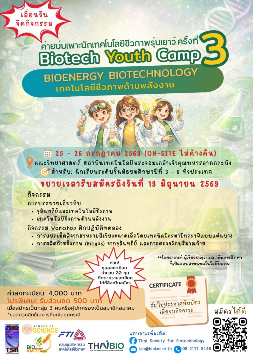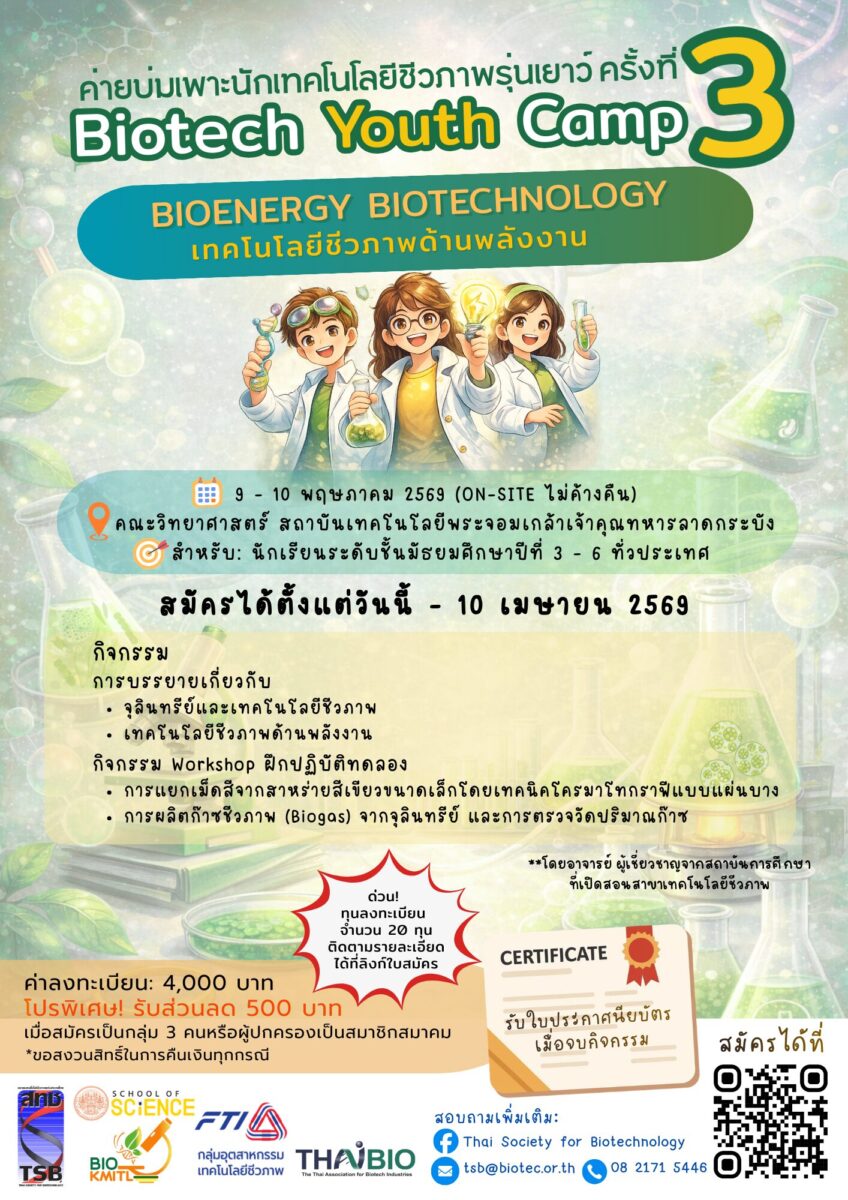 เปิดรับสมัครแล้ว !! ค่ายบ่มเพาะนักเทคโนโลยีชีวภาพรุ่นเยาว์ BIOTECH YOUTH CAMP ครั้งที่ 3