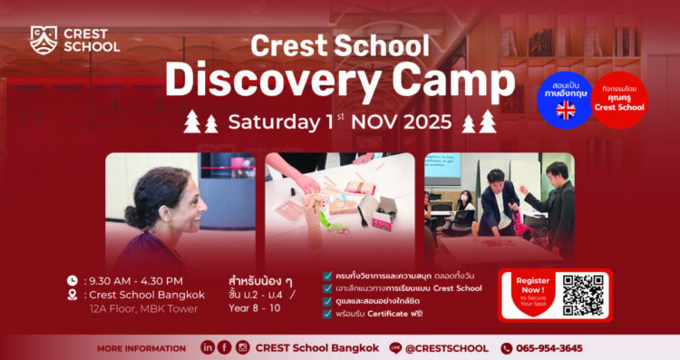 กิจกรรม Discovery Camp 1 วันที่จะพาน้องๆไปรู้จักกับการเรียนการสอนแบบ Crest School Bangkok ที่เน้นการบูรณาการวิชาการ เข้ากับกิจกรรมเสริมทักษะ สอนโดยครูในโรงเรียนตัวจริง เป็นภาษาอังกฤษ
