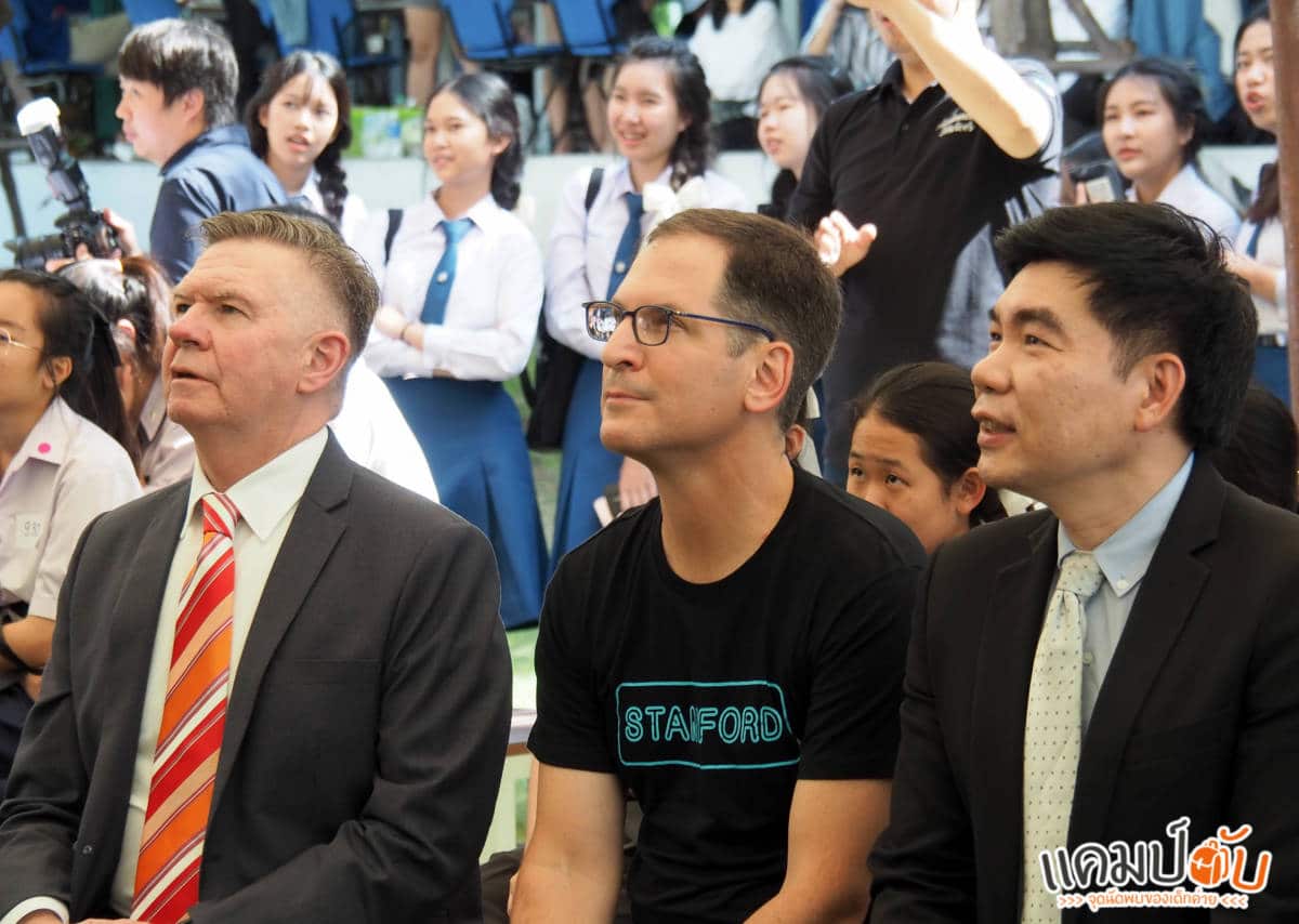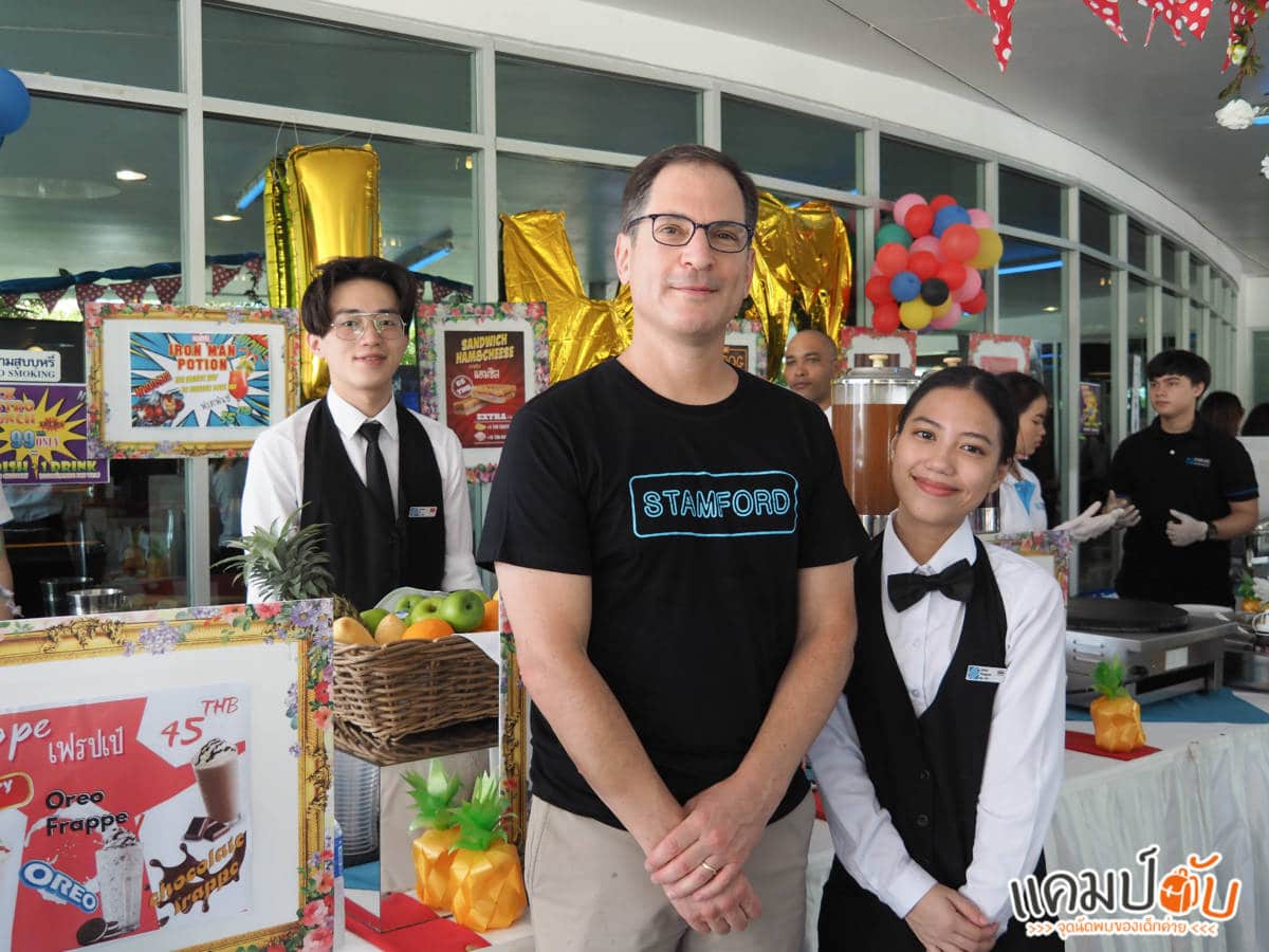 คนแรกที่มารอต้อนรับหน้าประตูอย่างอบอุ่น ก็คือ ดร.แอนดรูว์ สกาวน์ อธิการบดีมหาวิทยาลัยนานาชาติแสตมฟอร์ด ที่มากล่าวต้อนรับน้องๆ พร้อมด้วยใบหน้ายิ้มแย้ม อารมณ์ขัน ที่บอกให้น้องๆ ทุกคน Have Fun กับกิจกรรมในวันนี้