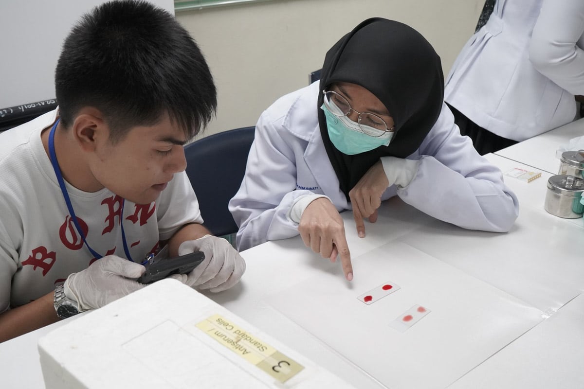 แล้วก็ต่อกันด้วยสาขาที่ 2 ก็คือฐานสาขาเทคนิคการแพทย์ ขอบอกเลยว่าสาขาที่แยกออกมาจากสาขานี้เยอะมาก เลยมีกิจกรรมให้ทำเยอะมากเช่นกัน ทั้งได้ส่องเชื้อ เม็ดเลือดแดง เม็ดเลือดขาว หรือว่าการเจาะเลือด ตรวจเลือด สิ่งนำตรวจ ต่างๆ มากมาย