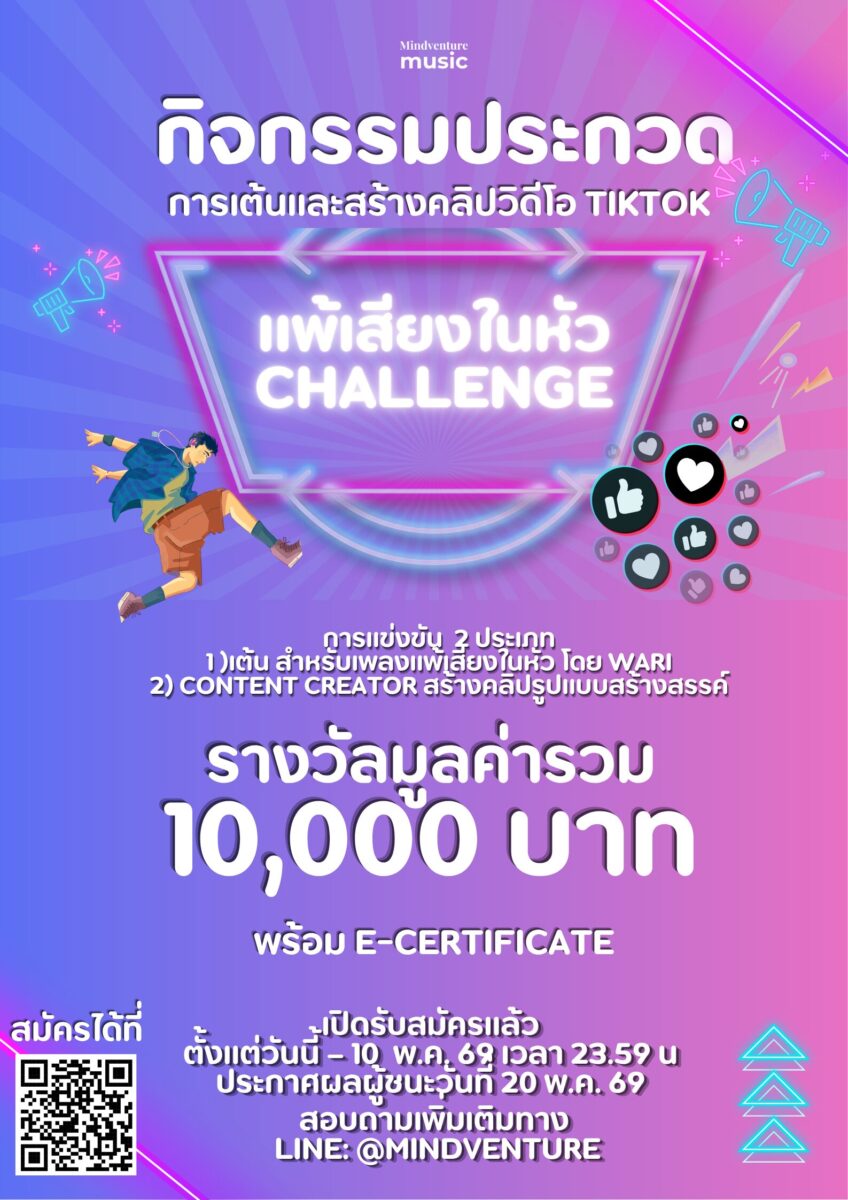 📢 ขอเชิญชวนน้อง ๆ เยาวชน อายุ 15 ปี ขึ้นไป และบุคคลทั่วไปเข้าร่วมกิจกรรมประกวดการคิดท่าเต้นและสร้างสรรค์วิดีโอ เพลงแพ้เสียงในหัว Challenge by Mindventure Music