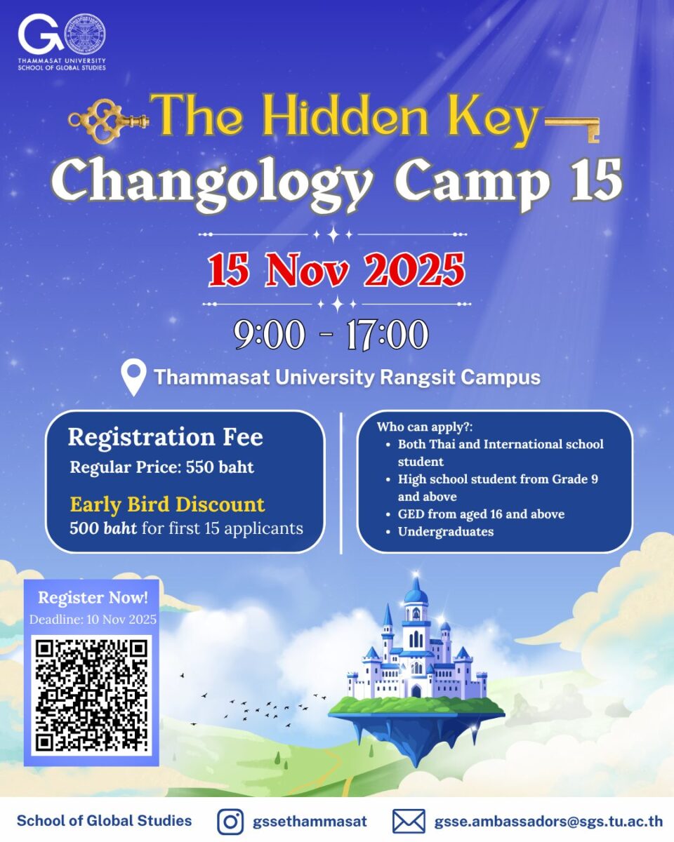 ค่าย ChanGOlogy ปีนี้เชิญคุณ ไขประตูสู่ความคิดสร้างสรรค์ การคิดวิเคราะห์ และการสร้างการเปลี่ยนแปลง ค่ายนี้จะพาคุณไปสำรวจประเด็นสังคมปัจจุบัน และเปิดโอกาสให้คุณคิดค้นแนวทางแก้ปัญหาใหม่ ๆ สำหรับสังคม สำหรับผู้ที่สนใจ นี่คือโอกาสของคุณที่จะเข้าร่วมและรู้จักโปรแกรม Global Studies and Social Entrepreneurship มหาวิทยาลัยธรรมศาสตร์