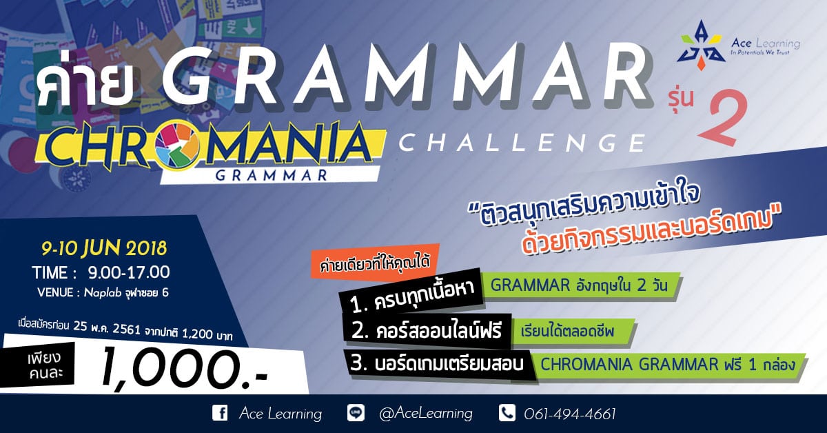 เชิญชวน น้องๆ มาเปลี่ยนการเรียนที่แสนน่าเบื่อ ให้สนุกสนานยิ่งขึ้น โดยเป็นการสรุปเนื้อหาแกรมมาร์ระดับมัธยมทั้งหมด แล้วนำความรู้มาใช้จริงผ่านการร่วมเล่นกิจกรรมกลุ่ม และเล่นบอร์ดเกม Chromania Grammar ที่อัดแน่นไปด้วยเนื้อหาไวยากรณ์ภาษาอังกฤษอย่างครบถ้วน เรียกได้ว่ายิ่งเล่นยิ่งได้ความรู้และความสนุกสนาน พร้อมรับประกาศนียบัตรและมีทุนการศึกษาให้สำหรับผู้ที่ชนะ