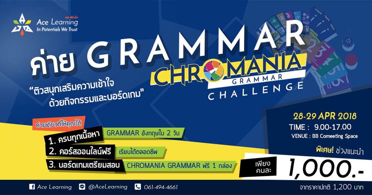 หมดเวลากับการเรียนแกรมม่าแบบน่าเบื่อ แถมได้ลุ้นทุนการศึกษา พร้อมใบประกาศณียบัตร และรางวัลมากมาย มาเรียนรู้แกรมม่าผ่านกิจกรรมและเกม interactive พร้อมท้าทายสมองผ่านเกม Chromania Grammar by Ace Learning เรียนสไตล์เล่น แต่เน้นไปที่การเรียนรู้อย่างลึกซึ้งใน 2 วัน