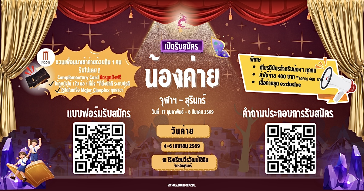6. โครงการจะเปิดรับสมัครผู้เข้าร่วมตั้งแต่วันที่ 17 กุมภาพันธ์ – 8 มีนาคม 2569 และจะมีการประกาศผลผู้ที่ได้รับคัดเลือกในวันที่ 12 มีนาคม 2569 ผ่านเอกสารการประกาศผล การประกาศผ่านอีเมลและช่องทางอินสตาแกรม (Instagram) chulasurin.official