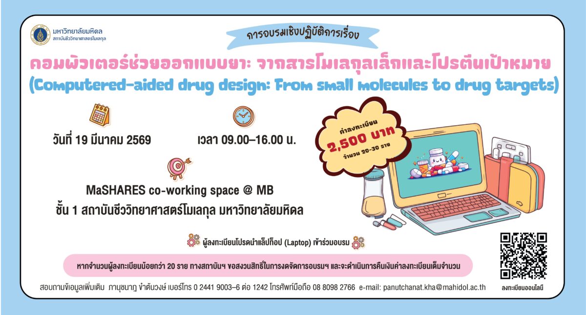 ดูรายละเอียดและสมัครได้ที่ : https://mb.mahidol.ac.th/th/computered-aided-drug-design/