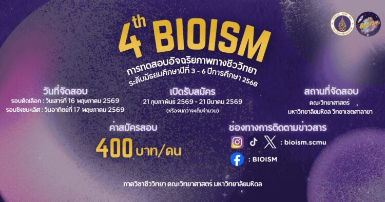 4th Bioism โครงการทดสอบอัจฉริยภาพชีววิทยา โดยภาควิชาชีววิทยา คณะวิทยาศาสตร์ มหาวิทยาลัยมหิดล ชวนนักเรียน ม.3–6 ประลองความรู้ ชิงรางวัลรวมกว่า 50,000 บาท เปิดรับสมัครแล้ว!