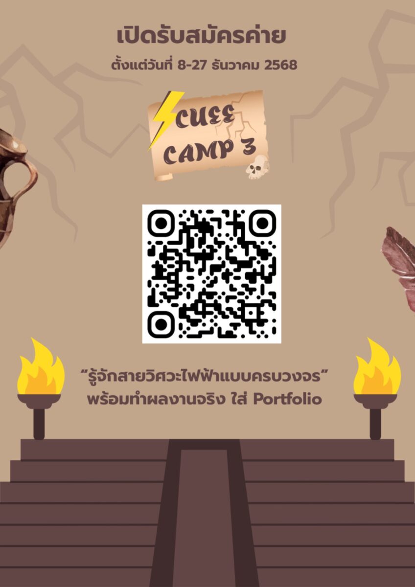 ค่าย CUEE CAMP ครั้งที่ 3 เป็นค่ายที่จัดให้น้องๆ มัธยมศึกษาชั้นปีที่ 4-5 หรือ เทียบเท่า เพื่อให้น้องๆ ได้มารู้จักกับ “ วิศวกรรมไฟฟ้า ” มากขึ้น ไม่ว่าจะเป็น ไฟฟ้ากำลัง ไฟฟ้าสื่อสาร ระบบควบคุม อิเล็กทรอนิกส์ น้องๆจะได้เรียนรู้แบบจัดเต็ม ตลอดระยะเวลา 7 วัน พร้อมทำ Project และได้เกียรติบัตรเอาไว้ใส่ Portfolio ได้อีกด้วย