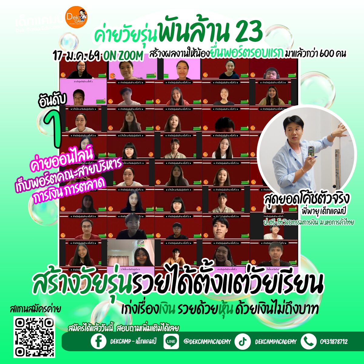 มาเป็นวัยรุ่นพันล้านตั้งแต่วันนี้ ลงทุนหุ้น วัยรุ่นทำได้ ใช้เงินเพียงเศษสตางค์ เรียนรู้แวดวงการเงิน การธนาคาร การลงทุน สร้างความคิดแบบเศรษฐีในตัวคุณเพื่อวันข้างหน้าจะสบาย และความรู้นี้ใช้หาเงินได้เลยทันทีหลังจบค่ายของเรา “เพราะความรวย ไม่เคยเลือกอายุ” อย่าพลาดโอกาส สมัครเลย