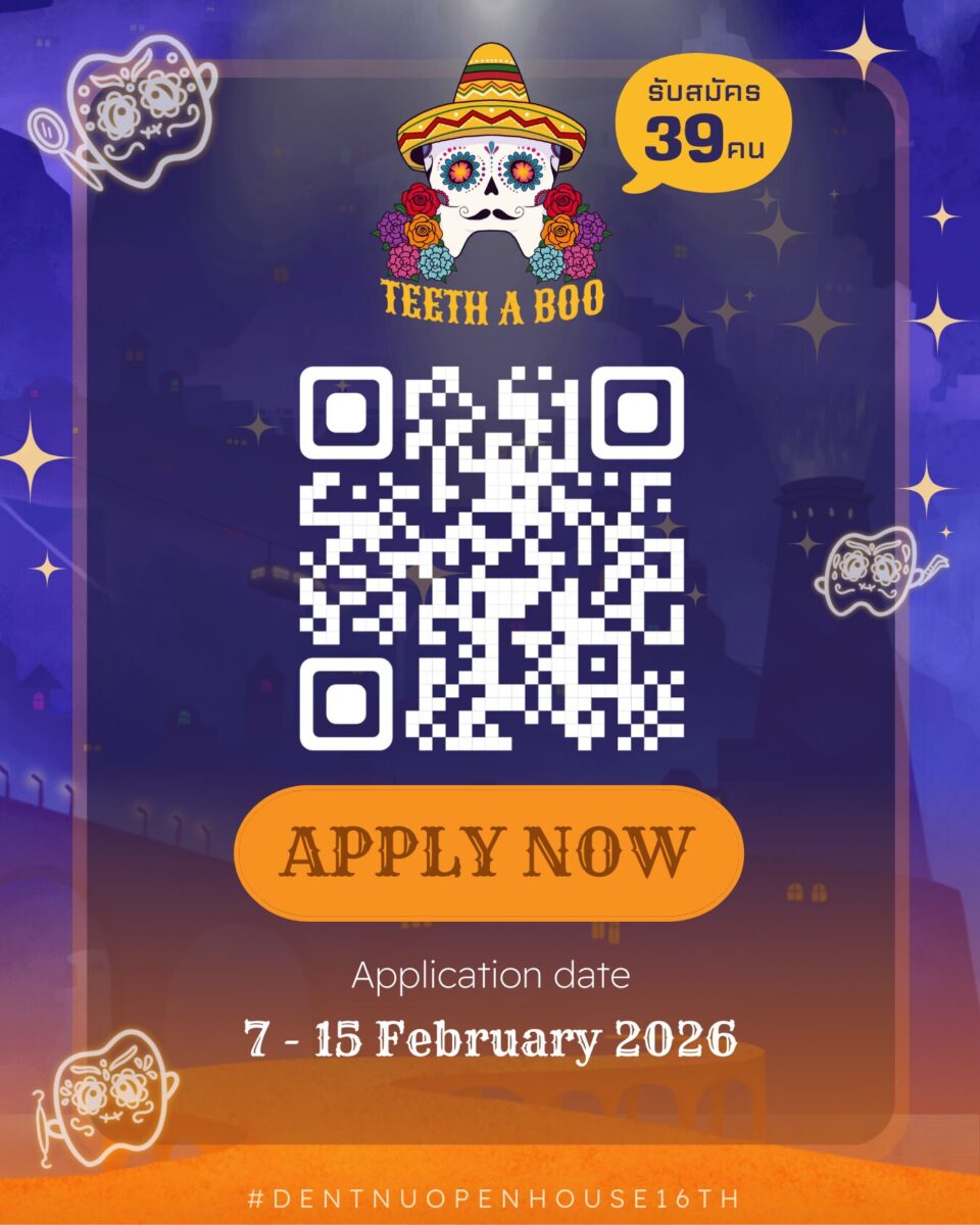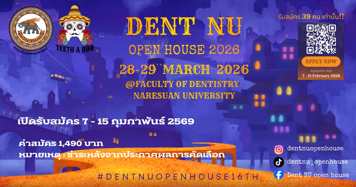 น้อง ๆ ที่มีความสนใจในคณะทันตแพทยศาสตร์ มหาวิทยาลัยนเรศวร และสนใจเข้าร่วม ค่าย Dent NU Open House (Dia de los Muertos) ซึ่งจัดขึ้นเพื่อให้น้อง ๆ ได้สัมผัสประสบการณ์เกี่ยวกับวิชาชีพทันตแพทย์
