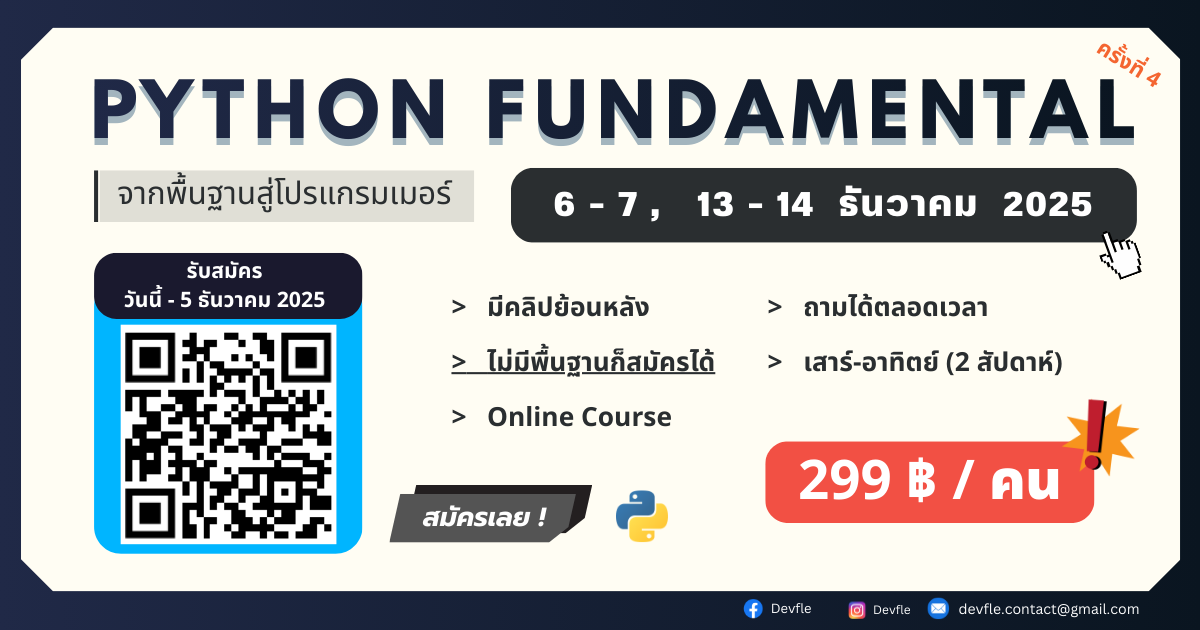 ในคอร์ส “Python Fundamental : จากพื้นฐานสู่โปรแกรมเมอร์” น้อง ๆ จะได้ปูพื้นฐานการเขียนโค้ดแบบเข้าใจง่ายสุด ๆ พร้อมทำ มินิโปรเจกต์ สนุก ๆ ท้ายคอร์ส เพื่อให้เห็นภาพการใช้งานจริง 🚀