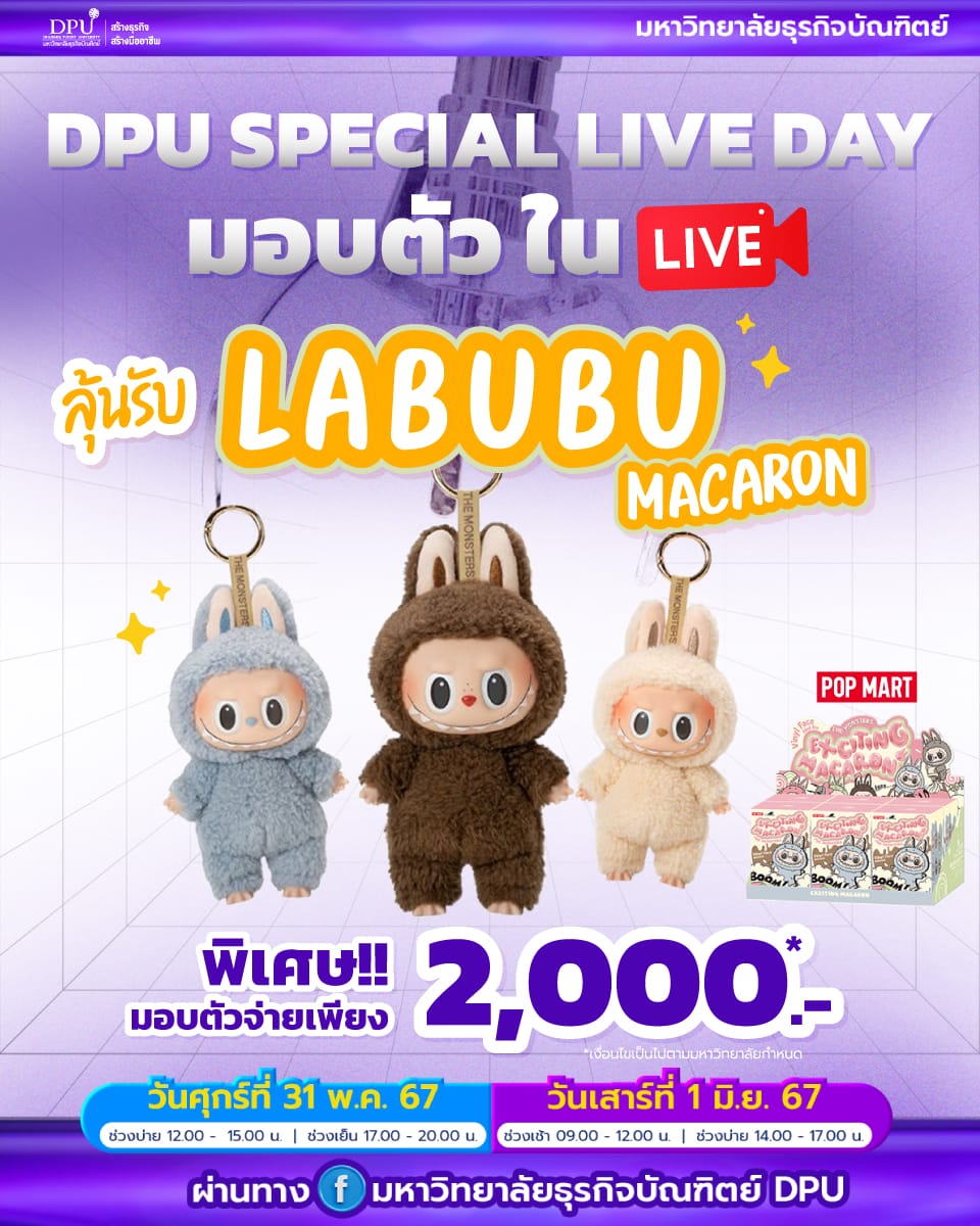 คัมแบคอีกครั้งกับกิจกรรมโดนใจวัยมัธยม DPU SPECIAL LIVE DAY ไลฟ์สุดพิเศษจากมหาวิทยาลัยธุรกิจบัณฑิตย์ จัดเต็มช่วงโค้งสุดท้ายก่อนเปิดเทอม 2567 นี้! โดยรอบนี้มาพร้อมกล่องจุ่มสุดแมสอย่าง Labubu และ Crybaby x Powerpuff Girls Series ให้ลุ้นซีเคร็ทกันแบบฉ่ำๆ ที่สำคัญพลาดไม่ได้กับการ Unbox หลักสูตรเจาะลึกทุกคณะแบบไม่กั๊ก เพื่อเตรียมพร้อมสู่การเป็นเด็กมหาลัยเต็มตัว นอกจากนี้ยังมีสิทธิพิเศษแน่นเอี๊ยด มอบตัวผ่านไลฟ์จ่ายเพียง 2,000 บาท รับทุนการศึกษาและรับฟรี iPad Gen 10 มูลค่ารวม 25,000 บาทอีกด้วย ห้ามพลาดไลฟ์สุดพิเศษ วันที่ 31 พ.ค. 2567 เวลา 12.00 น. เป็นต้นไป และวันที่ 1 มิ.ย. 2567 เวลา 09.00 น. เป็นต้นไป ทาง Facebook มหาวิทยาลัยธุรกิจบัณฑิตย์ DPU