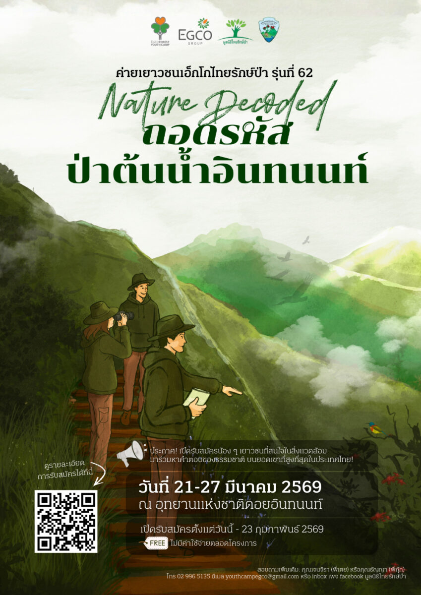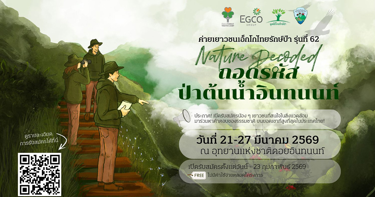บริษัท ผลิตไฟฟ้า จำกัด (มหาชน) หรือ EGCO Group และมูลนิธิไทยรักษ์ป่า องค์กรสาธารณกุศลซึ่งก่อตั้งและสนับสนุนการดำเนินงานโดย EGCO Group ร่วมกับอุทยานแห่งชาติดอยอินทนนท์ ชวนเยาวชนระดับมัธยมศึกษาตอนปลายหรือเทียบเท่าจากทั่วประเทศ มาร่วมภารกิจไขรหัสลับของธรรมชาติ ผ่านการสัมผัสป่าต้นน้ำด้วยตนเอง กับ “ค่ายเยาวชนเอ็กโกไทยรักษ์ป่า รุ่นที่ 62” ภายใต้แนวคิด “Nature Decoded: ถอดรหัสป่าต้นน้ำอินทนนท์” ระหว่างวันที่ 21 – 27 มีนาคม 2569 ณ อุทยานแห่งชาติดอยอินทนนท์ จังหวัดเชียงใหม่ เพื่อปลูกจิตสำนึกรักษ์ธรรมชาติและส่งเสริมการดำเนินชีวิตที่อยู่ร่วมกับสิ่งแวดล้อมอย่างยั่งยืน เยาวชนหัวใจกรีนที่สนใจ สามารถส่งผลงานเป็น “เรียงความ” หรือ “คลิปวิดีโอสั้น” เพื่อสมัครร่วมค่ายเยาวชนฯ ได้ตั้งแต่วันนี้ – 23 กุมภาพันธ์ 2569
