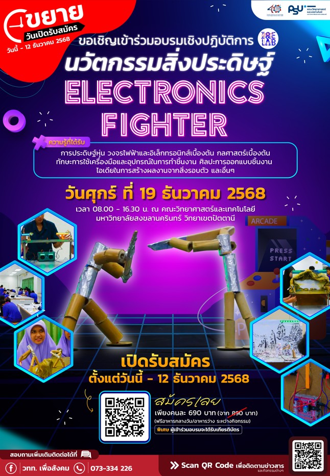 คณะวิทยาศาสตร์และเทคโนโลยี ขอเชิญเข้าร่วมอบรมเชิงปฏิบัติการ ”นวัตกรรมสิ่งประดิษฐ์ Electronics Fighter Game