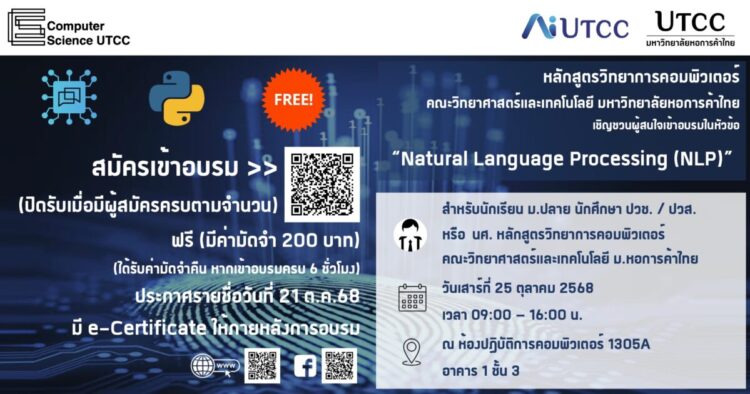 [[ เติมความรู้ด้าน AI ให้ล้ำกว่าใคร ]] 📌📌 หลักสูตรวิทยาการคอมพิวเตอร์ ม.หอการค้าไทย จัดอบรมในหัวข้อ "Natural Language Processing (NLP)" ++ รับจำนวนจำกัด เพียง 30 คน ++ ฟรี !! สมัครเลย !!