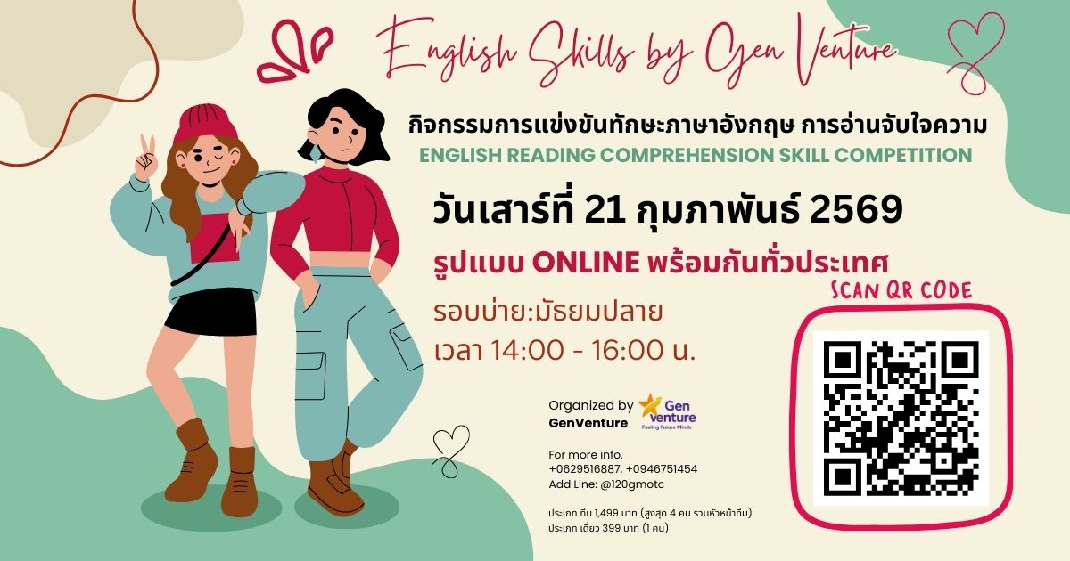 ในโลกที่ภาษาอังกฤษไม่ใช่แค่ “วิชาหนึ่งในห้องเรียน” แต่คือทักษะสำคัญในการเรียนรู้ คิดวิเคราะห์ และเปิดโอกาสสู่อนาคต Youth English Reading Comprehension Contest จึงถูกออกแบบขึ้นเพื่อเป็นเวทีที่ช่วยให้นักเรียนได้ “อ่านอย่างเข้าใจ คิดอย่างมีเหตุผล และมั่นใจในศักยภาพของตนเอง” การแข่งขันนี้มุ่งเน้นการพัฒนาทักษะ English Reading Comprehension สำหรับนักเรียนระดับมัธยมปลาย อายุ 16–18 ปี ผ่านรูปแบบการแข่งขันออนไลน์ที่เข้าถึงได้จากทุกที่ ผู้เข้าแข่งขันสามารถเลือกเข้าร่วมได้ทั้ง ประเภทเดี่ยว และ ประเภททีม เพื่อเรียนรู้ทั้งการพัฒนาตนเอง และการทำงานร่วมกับผู้อื่น ตลอดการแข่งขัน นักเรียนจะได้ฝึกการอ่านเชิงลึก การคิดวิเคราะห์ การตีความ และการตัดสินใจ ในบรรยากาศที่ทั้ง ท้าทาย สนุก และปลอดภัยทางการเรียนรู้ ไม่ใช่เพื่อวัดว่าใครเก่งกว่าใคร แต่เพื่อให้ทุกคนได้ “แข่งขันกับตัวเอง” และค้นพบศักยภาพที่แท้จริง โครงการนี้ริเริ่มโดย GenVenture ตั้งแต่ปี 2567 และก้าวเข้าสู่ปีที่ 3 ในปี 2569 จนถึงปัจจุบัน มีเยาวชนเข้าร่วมกิจกรรมแล้วมากกว่า 500 คนจากทั่วประเทศ สะท้อนถึงความเชื่อมั่นของผู้ปกครอง โรงเรียน และนักเรียน ที่มองเห็นคุณค่าของการพัฒนาทักษะภาษาอังกฤษอย่างมีเป้าหมาย Youth English Reading Comprehension Contest ไม่ใช่เพียงการแข่งขัน แต่คือพื้นที่แห่งการเรียนรู้ แรงบันดาลใจ และก้าวแรกของการเติบโตทางวิชาการ ที่ช่วยเตรียมความพร้อมให้เยาวชนก้าวสู่อนาคตอย่างมั่นใจ