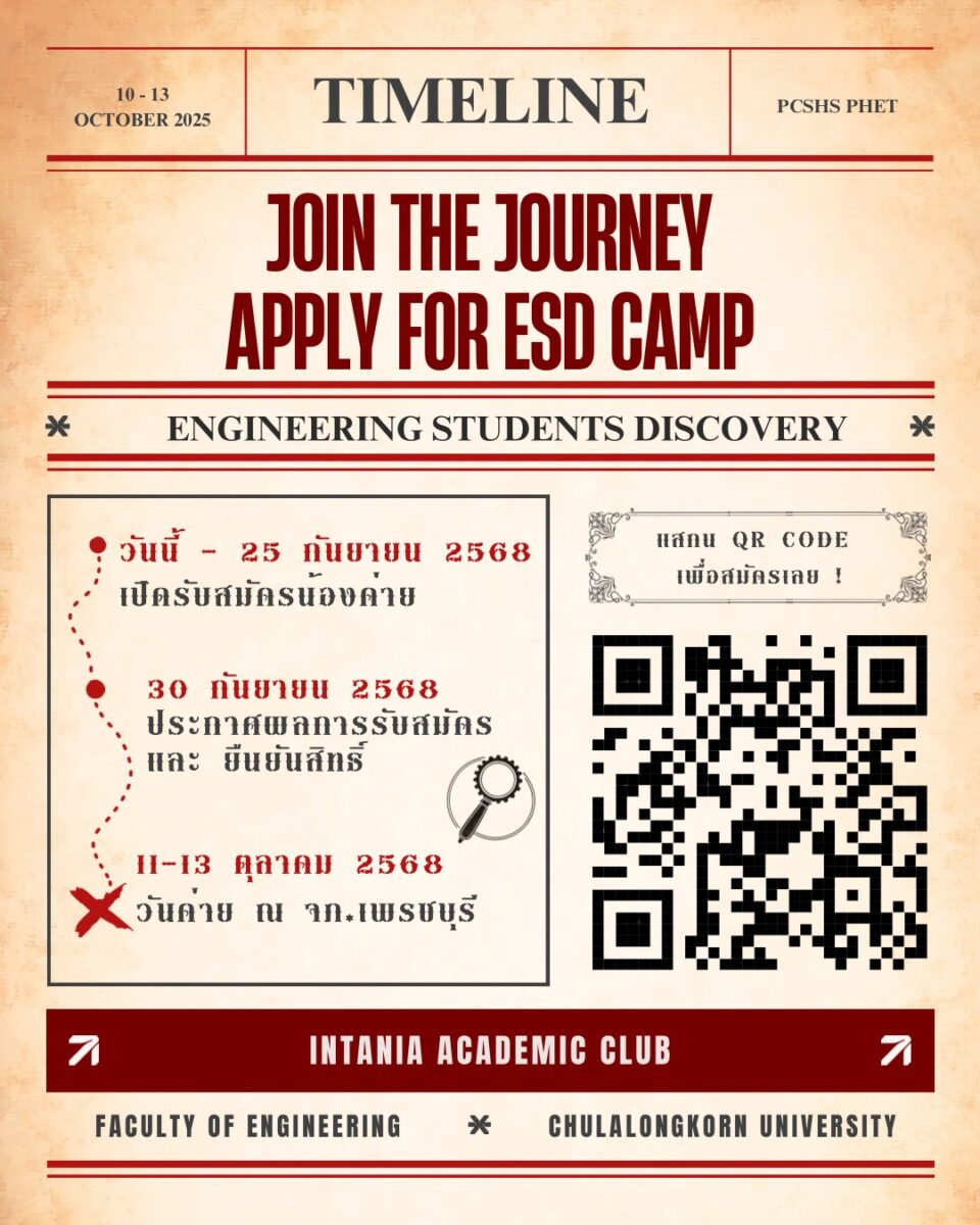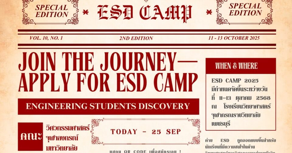ค่าย ESD (Engineering Student Discovery) เป็นค่ายแนะแนวที่จัดขึ้นเพื่อให้น้อง ๆ มัธยมปลายได้มีโอกาสค้นหาตัวเองว่าเหมาะสมกับสายวิศวกรรมศาสตร์มากน้อยเพียงใด ผ่านกิจกรรมที่ทั้งสนุกและเต็มไปด้วยสาระ ไม่ว่าจะเป็นกิจกรรมเชิงปฏิบัติการที่จำลองบรรยากาศการเรียนจริงในคณะวิศวกรรมศาสตร์ การบรรยายและการแชร์ประสบการณ์จากรุ่นพี่วิศวะที่พร้อมเล่าความจริงทั้งเบื้องหน้าและเบื้องหลัง รวมไปถึงการให้คำแนะนำด้านการวางแผนเรียนต่อ เทคนิคการสอบเข้ามหาวิทยาลัย และการเตรียมตัวอย่างเป็นระบบ นอกจากนี้ ค่ายยังมุ่งหวังให้น้อง ๆ ได้เห็นภาพที่ชัดเจนมากขึ้นว่าชีวิตในรั้ววิศวะเป็นอย่างไร ได้แลกเปลี่ยนมุมมองกับเพื่อนที่มีความฝันคล้ายกัน และได้รับแรงบันดาลใจในการกำหนดเป้าหมายอนาคตของตนเอง