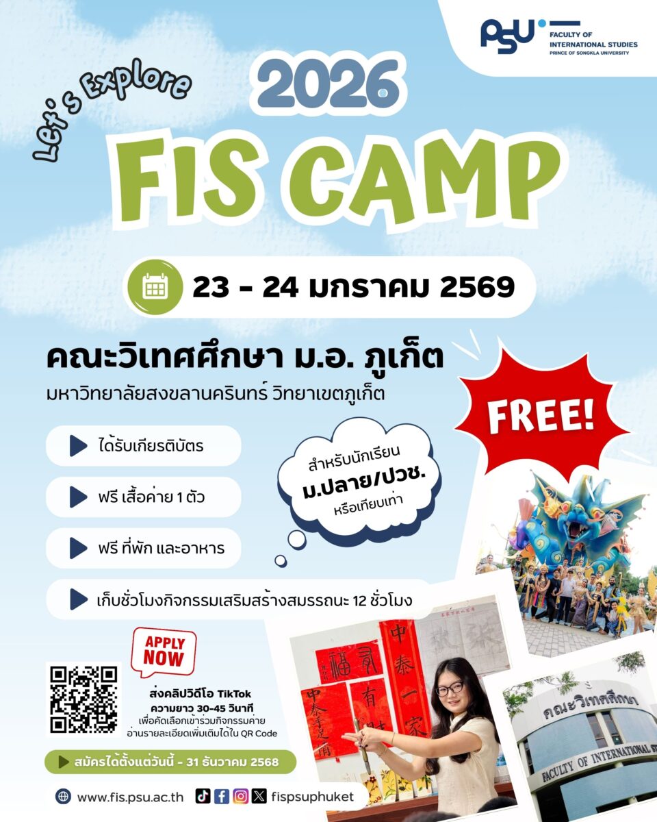 📣 คณะวิเทศศึกษา ขอเชิญชวนน้อง ๆ ระดับ ม.ปลาย / ปวช. / หรือเทียบเท่า เข้าร่วมกิจกรรม FIS CAMP 2026 👉 ไม่มีค่าใช้จ่าย