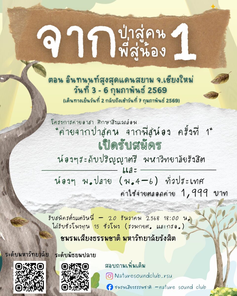 โครงการมีกำหนดจัดขึ้นระหว่างวันที่ 3 – 6 กุมภาพันธ์ 2569 ณ อุทยานแห่งชาติดอยอินทนนท์ จังหวัดเชียงใหม่ โดยมีนักศึกษามหาวิทยาลัยรังสิตและเยาวชนระดับมัธยมเข้าร่วมประมาณ 70 คน กิจกรรมภายในโครงการประกอบด้วยการเรียนรู้ระบบนิเวศภาคสนาม กิจกรรมจิตอาสาเพื่อน้อง กิจกรรมอนุรักษ์ธรรมชาติ กิจกรรมกลุ่มสัมพันธ์ และกิจกรรมแลกเปลี่ยนประสบการณ์ข้ามรุ่นระหว่าง “พี่สตาฟ” “พี่มหาวิทยาลัย” และ “น้องมัธยม” เพื่อเสริมสร้างทักษะชีวิตและความเข้าใจระหว่างวัย