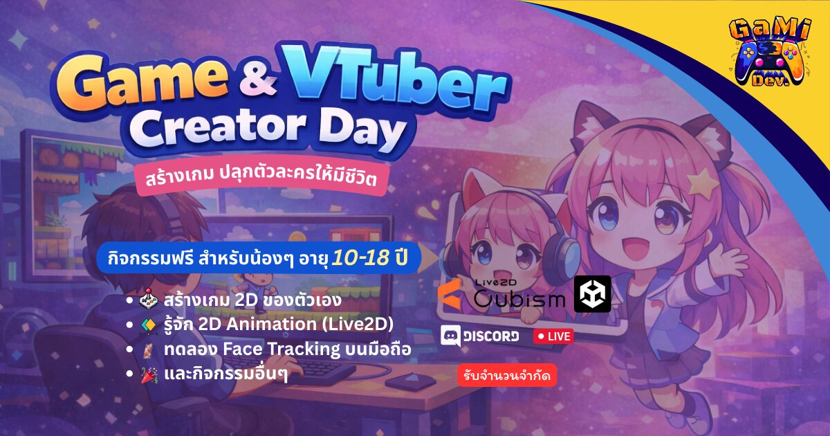 พาน้อง ๆ มาสนุกกับโลกของการสร้างเกมและตัวละครดิจิทัล ในกิจกรรมวันเด็กสุดพิเศษ ที่ไม่ได้แค่ “เล่นเกม” แต่ได้ ลงมือสร้างเกม 2D ของตัวเองจริง ตั้งแต่การควบคุมตัวละคร วางฉาก ไปจนถึงเข้าใจหลักการทำงานของเกมแบบง่าย ๆ เหมาะสำหรับเด็กอายุ 10–19 ปี ไม่จำเป็นต้องมีพื้นฐานมาก่อน