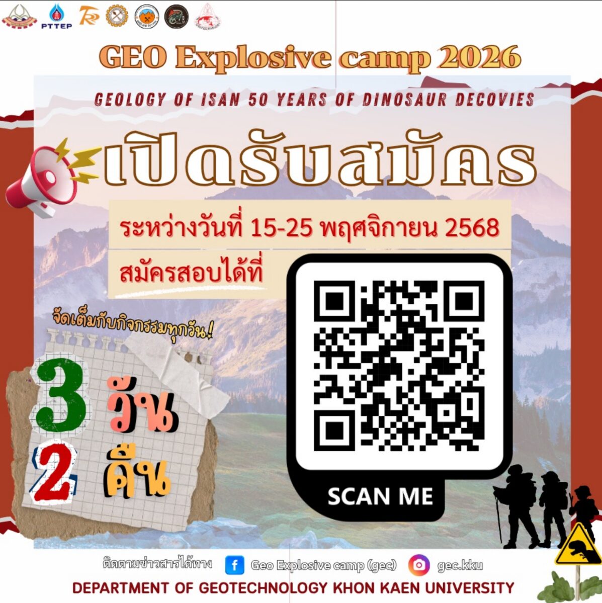 Geo Explosive Camp 2026 ในหัวข้อ GEOLOGY OF ISAN 50 YEARS OF DINOSAUR DECOVIES ขอเชิญชวนน้องๆ ม.4-5 สายวิทย์-คณิต ในภาคตะวันออกเฉียงเหนือ มาร่วมเปลี่ยนห้องเรียนธรรมดาให้เป็นสนามผจญภัยสุดเร้าใจ! ⚒️ ค่ายที่จะพาไปลุยจริง เรียนรู้จริง 3 วัน 2 คืน เต็มๆ!