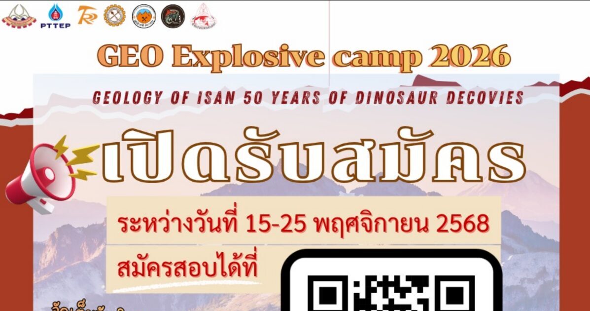 Geo Explosive Camp 2026 ในหัวข้อ GEOLOGY OF ISAN 50 YEARS OF DINOSAUR DECOVIES ขอเชิญชวนน้องๆ ม.4-5 สายวิทย์-คณิต ในภาคตะวันออกเฉียงเหนือ มาร่วมเปลี่ยนห้องเรียนธรรมดาให้เป็นสนามผจญภัยสุดเร้าใจ! ⚒️ ค่ายที่จะพาไปลุยจริง เรียนรู้จริง 3 วัน 2 คืน เต็มๆ!