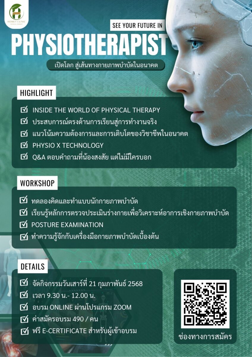 ภายในกิจกรรมจะมีการพูดคุยในหัวข้อ See your Future in Physiotherapist – เปิดโลกและพาไปรู้จักเส้นทางสู่อาชีพนักกายภาพบำบัด ผ่านประสบการณ์ตรงตั้งแต่ช่วงการเรียน การฝึกปฏิบัติจริง ไปจนถึงการทำงานในวิชาชีพ พร้อมถ่ายทอดการปรับตัวสู่การเป็นนักกายภาพบำบัดมืออาชีพในยุคที่เทคโนโลยีมีบทบาทสำคัญ และแนวโน้มของตลาดด้าน Medical & Health ในอนาคต