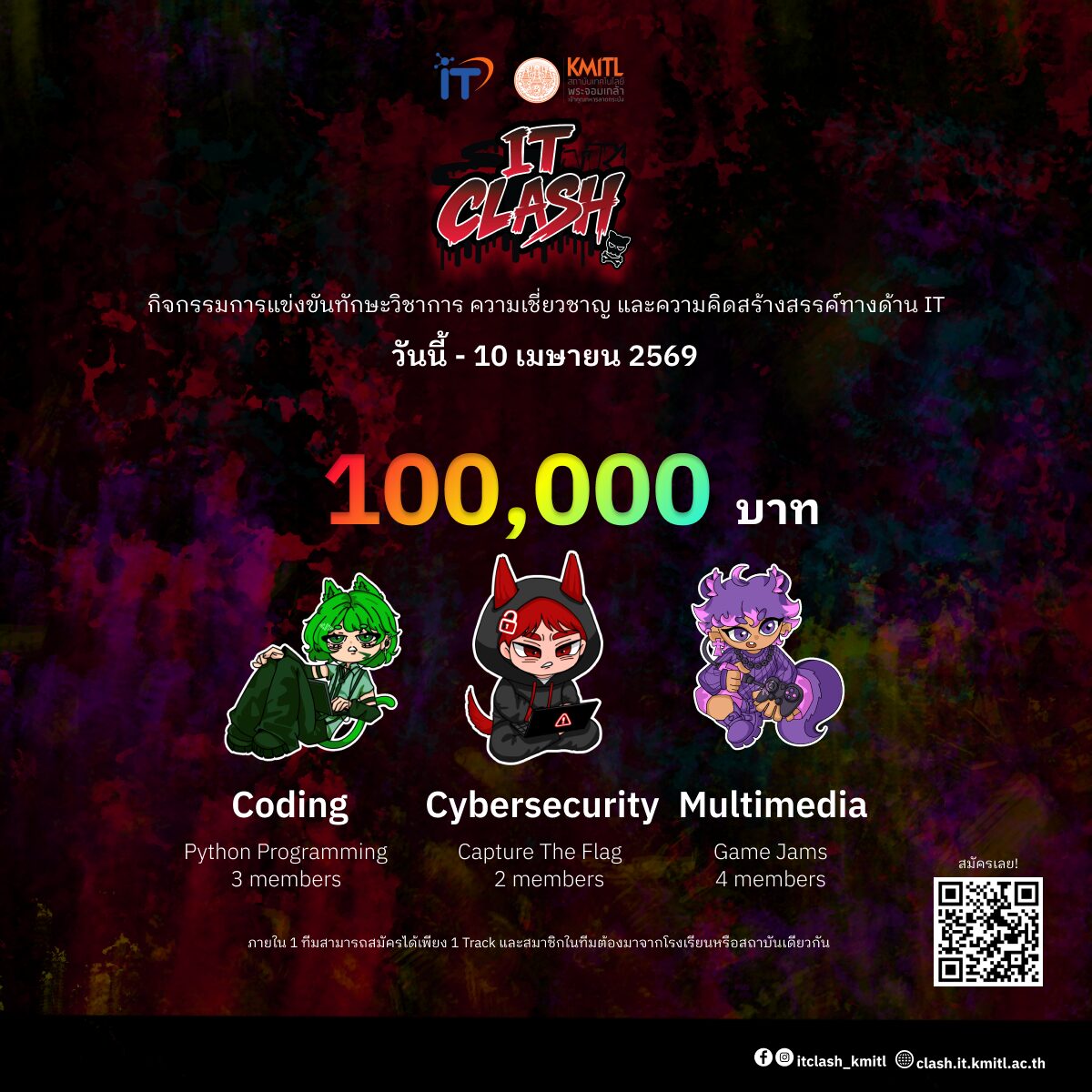 IT Clash 69 āļāļ·āļāļāļēāļĢāđāļāđāļāļāļąāļāļāļąāļāļĐāļ°āļ§āļīāļāļēāļāļēāļĢāļāđāļēāļāđāļāļāđāļāđāļĨāļĒāļĩāļŠāļēāļĢāļŠāļāđāļāļĻāļāļĩāđāļāļąāļāļāļķāđāļāđāļāļ·āđāļāđāļāļīāļāđāļāļāļēāļŠāđāļŦāđāļāļąāļāđāļĢāļĩāļĒāļāļĢāļ°āļāļąāļāļĄāļąāļāļĒāļĄāļĻāļķāļāļĐāļēāļāļāļāļāļĨāļēāļĒāđāļĨāļ°āļĢāļ°āļāļąāļāļāļĢāļ°āļāļēāļĻāļāļĩāļĒāļāļąāļāļĢāļ§āļīāļāļēāļāļĩāļ (āļāļ§āļ.) āđāļāđāđāļŠāļāļāļĻāļąāļāļĒāļ āļēāļ āļāļ§āļēāļĄāļĢāļđāđ āđāļĨāļ°āļāļ§āļēāļĄāļāļīāļāļŠāļĢāđāļēāļāļŠāļĢāļĢāļāđāļāđāļēāļ IT āļāđāļēāļāļāļēāļĢāđāļāđāļāļāļąāļāļāļĩāđāļāđāļēāļāļēāļĒāļāļ§āļēāļĄāļŠāļēāļĄāļēāļĢāļāđāļāļŦāļĨāļēāļāļŦāļĨāļēāļĒāļāđāļēāļ āđāļĄāđāļ§āđāļēāļāļ°āđāļāđāļāļāļēāļĢāđāļāļĩāļĒāļāđāļāļĢāđāļāļĢāļĄ āļāļ§āļēāļĄāļĢāļđāđāļāđāļēāļāļāļ§āļēāļĄāļĄāļąāđāļāļāļāļāļĨāļāļāļ āļąāļĒāļāļēāļāđāļāđāļāļāļĢāđ āđāļĨāļ°āļāļēāļĢāļŠāļĢāđāļēāļāļŠāļĢāļĢāļāđāļāļĨāļāļēāļāļĄāļąāļĨāļāļīāļĄāļĩāđāļāļĩāļĒ āđāļāļĒāļĄāļĩāđāļāđāļēāļŦāļĄāļēāļĒāđāļāļ·āđāļāļŠāđāļāđāļŠāļĢāļīāļĄāļāļēāļĢāļāļąāļāļāļēāļāļąāļāļĐāļ°āļāđāļēāļāđāļāļāđāļāđāļĨāļĒāļĩāļāļāļāđāļĒāļēāļ§āļāļ āļāļĢāđāļāļĄāļāļąāđāļāđāļāļīāļāļĄāļļāļĄāļĄāļāļāđāļĨāļ°āđāļŠāđāļāļāļēāļāļŠāļđāđāļāļēāļĢāļĻāļķāļāļĐāļēāļāđāļāđāļāļĢāļ°āļāļąāļāļāļļāļāļĄāļĻāļķāļāļĐāļēāđāļāļŠāļēāļĒāđāļāļāđāļāđāļĨāļĒāļĩāđāļāļāļāļēāļāļ āļāļēāļĢāđāļāđāļāļāļąāļāđāļāđāļāļāļāļāđāļāđāļ 3 āļŠāļēāļĒ āđāļāđāđāļāđ Coding Track, Cybersecurity Track āđāļĨāļ° Multimedia Track (āđāļāđāļāļāļąāļāđāļāļāļēāļ°āļĢāļāļāļāļīāļāļāļāļ°āđāļĨāļīāļĻ) āđāļāļĒāļāļēāļĢāđāļāđāļāļāļąāļāļĢāļāļāļāļąāļāđāļĨāļ·āļāļāļŠāļģāļŦāļĢāļąāļ Coding Track āđāļĨāļ° Cybersecurity Track āļāļ°āļāļąāļāļāļķāđāļāđāļāļ§āļąāļāļāļĩāđ 19 āđāļĄāļĐāļēāļĒāļ 2569 āđāļĨāļ°āļāļēāļĢāđāļāđāļāļāļąāļāļĢāļāļāļāļīāļāļāļāļ°āđāļĨāļīāļĻāļāļ°āļāļąāļāļāļķāđāļāđāļāļ§āļąāļāļāļĩāđ 16 āļāļĪāļĐāļ āļēāļāļĄ 2569.