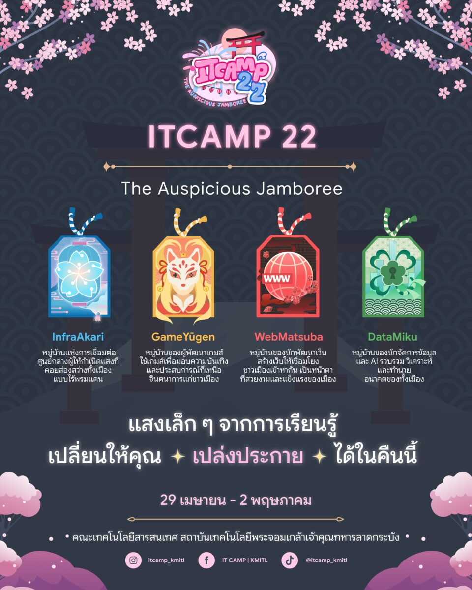 ค่าย ITCAMP ครั้งที่ 22 กลับมาแล้ว ค่ายที่เปิดโอกาสให้น้อง ๆ มาสัมผัสประสบการณ์การเรียนจริง ลงมือทำจริง กับ 4 ศาสตร์ด้านไอที ได้แก่ Website, Data Science & AI, Game และ Infrastructure พร้อมกิจกรรมสนุก ๆ อีกมากมาย ที่คณะเทคโนโลยีสารสนเทศ สจล. กับพี่ ๆ แบบใกล้ชิด ✨