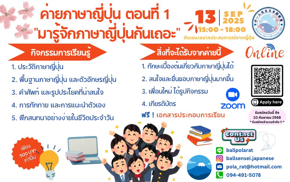 🗣️ ในเวลาเพียงแค่ 3️⃣ ชั่วโมง จะกลายเป็นจุดเริ่มต้นในการสร้างความสนใจในการเรียนภาษาญี่ปุ่นของน้องๆ จะทำให้น้อง ๆ ⭐️ มีความรู้พื้นฐานเกี่ยวกับภาษาญี่ปุ่น 🇯🇵 เช่น ประวัติภาษาญี่ปุ่น ตัวอักษร คำศัพท์และประโยคพื้นฐาน การฝึกพูดสนทนาภาษาญี่ปุ่น ฯลฯ 👍 โดยเราจะได้เรียนรู้อย่างมีความสุขและสนุกสนานควบคู่กับสาระความรู้ต่าง ๆ ไปด้วยกัน 🌸 ซึ่งจะทำให้สามารถวางเป้าหมายในการเรียนรู้ภาษาและวัฒนธรรมญี่ปุ่นในอนาคตต่อไปได้ โดยค่ายนี้ไม่จำเป็นต้องมีความรู้ภาษาญี่ปุ่นก็สามารถสมัครได้ 🥰😁 มาเปิดโอกาสให้ตัวเองกันครับ ⭐️🎈