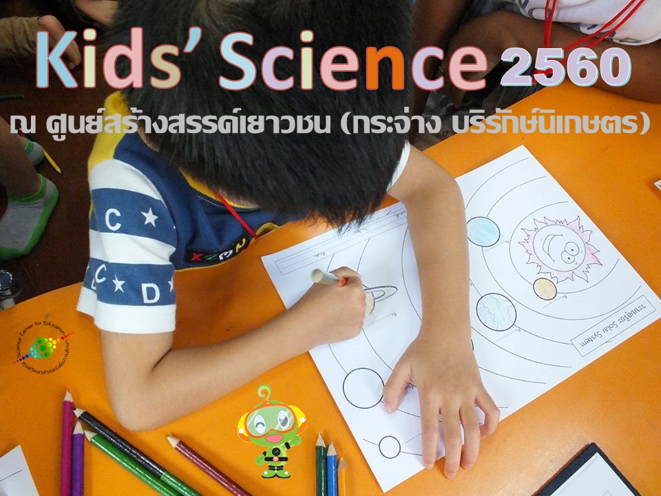 ในช่วงปิดภาคเรียนระหว่างปีการศึกษาครั้งนี้ ศูนย์สร้างสรรค์เยาวชน (กระจ่าง บริรักษ์นิติเกษตร) ได้จัดค่าย Kids’ Science 2560 ซึ่งเป็นกิจกรรมในรูปแบบของค่ายวิทยาศาสตร์ สำหรับเด็กวัย 5 – 6 ปี ในครั้งนี้ จัดกิจกรรมการเรียนรู้ด้านวิทยาศาสตร์ด้วยการสอดแทรกภาษาอังกฤษ ฝึกทักษะการคิดอย่างมีเหตุผลตามกระบวนการทางวิทยาศาสตร์ เพื่อสร้างเจตคติที่ดีต่อการเรียนรู้วิชาวิทยาศาสตร์ และฝึกการใช้ชีวิตอยู่ร่วมกับผู้อื่นในสังคม ค่าย Kids’ Science 2560 เป็นค่ายกลางวัน (ไม่ค้างคืน) ระหว่างวันที่ 28 – 29 มีนาคม พ.ศ. 2560 โดยวันอังคารที่ 28 มีนาคม พ.ศ. 2560 จัดกิจกรรม ณ ศูนย์สร้างสรรค์เยาวชน (กระจ่าง บริรักษ์นิติเกษตร) เขตคลองสาน และวันพุธที่ 29 มีนาคม พ.ศ. 2560 จัดกิจกรรม ณ ศูนย์วิทยาศาสตร์เพื่อการศึกษา (ท้องฟ้าจำลองกรุงเทพ)