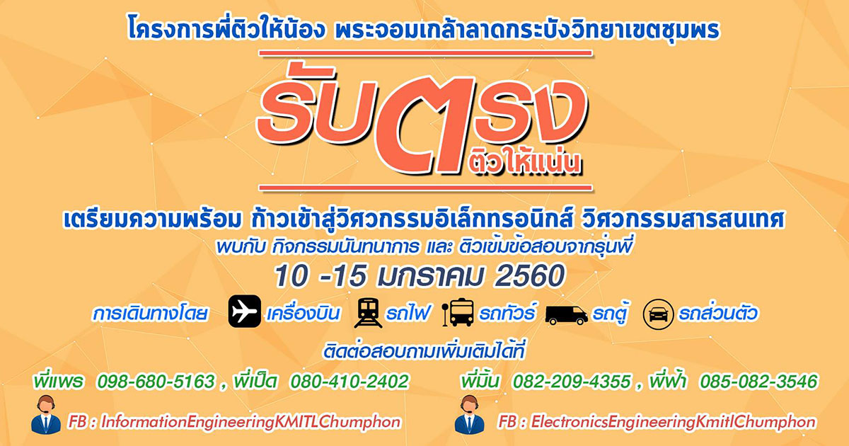 แล้วมาพบกันให้ได้ที่ “โครงการพี่ติวให้น้อง พระจอมเกล้าลาดกระบังวิทยาเขตชุมพร” นะครับ