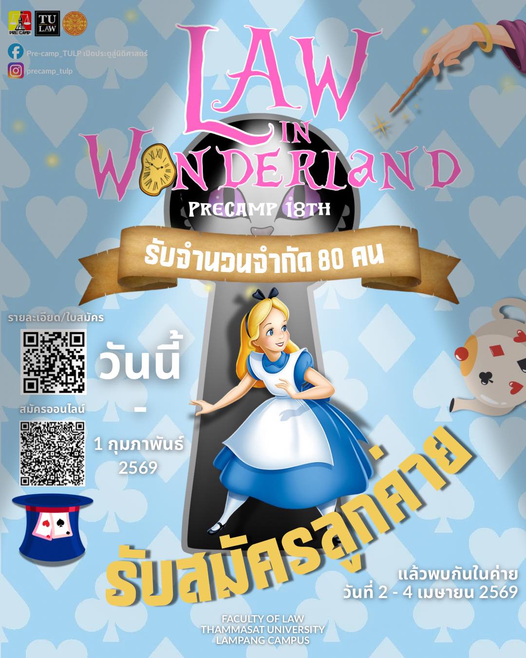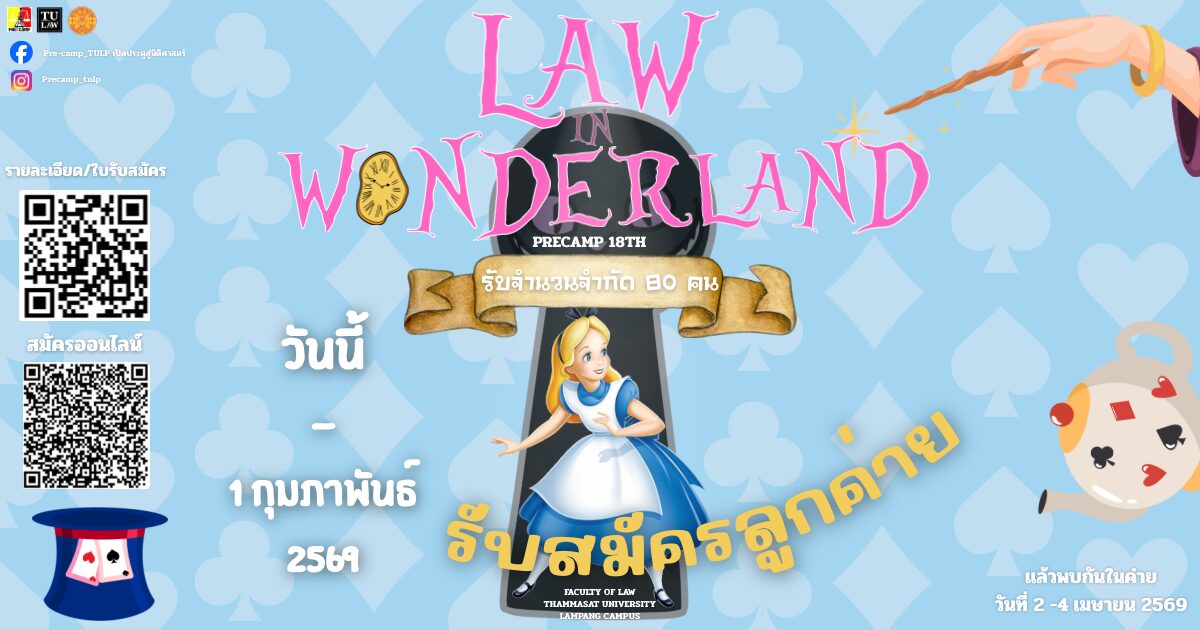 สิ้นสุดการรอคอยสำหรับน้อง ๆ มัธยมปลาย ม.4 – ม.6 🩵 ค่ายเปิดประตูสู่นิติศาสตร์ Pre-camp ครั้งที่ 18 ได้กลับมาอีกครั้งใน concept “Law in wonderland” พร้อมแล้วที่จะหาผู้กล้าที่จะเรียนรู้ไปด้วยกันในดินแดนมหัสจรรย์ แล้วมาพบกัน ณ มหาวิทยาลัยธรรมศาสตร์ ศูนย์ลำปาง