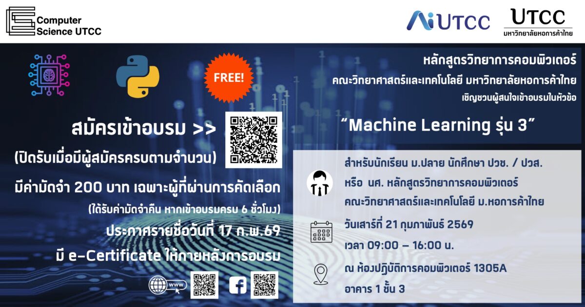 หลักสูตรวิทยาการคอมพิวเตอร์ คณะวิทยาศาสตร์และเทคโนโลยี ม.หอการค้าไทย จัดอบรมในหัวข้อ “Machine Learning รุ่น 3”