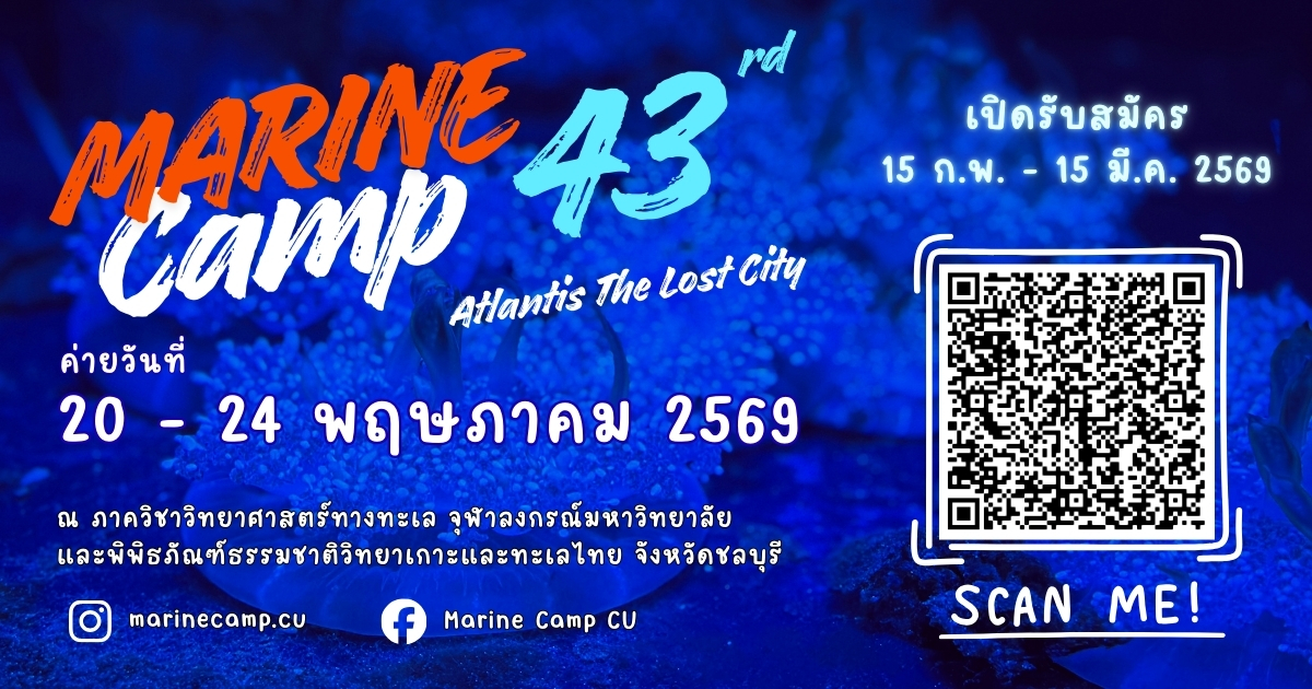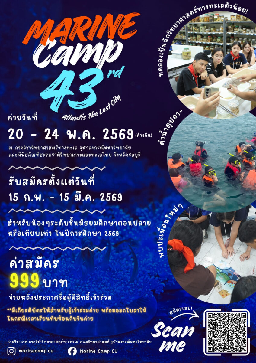 Marine Camp ครั้งที่ 43 จัดขึ้นโดยนิสิตจากภาควิชาวิทยาศาสตร์ทางทะเล คณะวิทยาศาสตร์ จุฬาลงกรณ์มหาวิทยาลัย เป็นค่ายวิชาการเกี่ยวกับวิทยาศาสตร์ทางทะเล สำหรับน้องๆในระดับชั้นมัธยมศึกษาตอนปลายหรือเทียบเท่า ในปีการศึกษา 2569 โดยมีวัตถุประสงค์เพื่อเผยแพร่ความรู้ทั่วไปทางด้านวิทยาศาสตร์ทางทะเลและการอนุรักษ์ทรัพยากรทางทะเลให้แก่น้องๆที่เข้าร่วม อีกทั้งเพื่อสร้างแรงบันดาลใจ ปลูกฝังจิตสำนึกในการอนุรักษ์ทะเล รวมถึงเพื่อให้น้องๆค้นหาตัวเอง โดยปีนี้มาใน Concept “Atlantis: The Lost City”🏛️🌊 น้องๆจะได้สวมบทบาทเป็นนักสำรวจทางทะเลที่ค้นหาความลับของโลกใต้ทะเล น้องๆจะได้ลงมือทำจริง เรียนรู้จริง ลุยจริงและสนุกจริงแน่นอน!