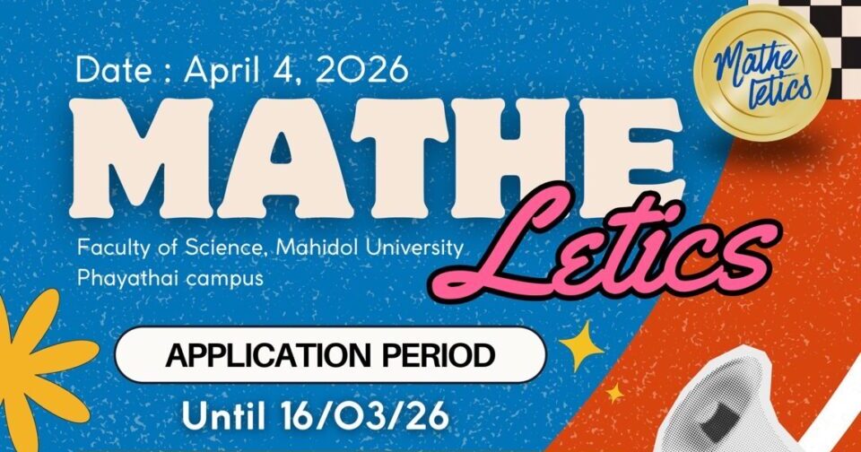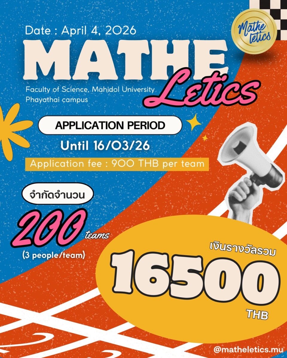 กิจกรรม Matheletics การแข่งขันทางคณิตศาสตร์ ประจำปีการศึกษา 2569 จะจัดขึ้นในวันเสาร์ที่ 4 เมษายน พ.ศ. 2569 ในรูปแบบ on-site โดยที่การแข่งขันจะแบ่งออกเป็นสองกิจกรรมดังนี้ กิจกรรมที่ 1 การสอบคัดเลือก โดยใช้โจทย์ทั้งหมด 45 ข้อรวมเป็น 100 คะแนน การสอบคัดเลือกจะเริ่มเวลา 09:00 น. ถึง 12:00 น. ประกอบไปด้วยข้อสอบปรนัย 40 ข้อและเติมตัวเลขในช่องว่าง 5 ข้อ จากนั้นจะนำคะแนนของกิจกรรมที่หนึ่งคัดเลือกทีมที่เหมาะสม เพื่อเข้าสู่กิจกรรมในช่วงบ่าย กิจกรรม Jeopardy การแข่งขันรอบบ่ายนี้จะดำเนินการทั้งหมด 2 รอบโดยใช้เวลารอบละ 60 นาที โดยจะเป็นการสุ่มเลือกหัวข้อ ข้อสอบ Unseen และเลือกระดับความยากเพื่อทำโจทย์ หลังจากจบการแข่งขันทั้งสองรอบจะทำการจัดอันดับกลุ่มโดยใช้คะแนนสะสมเพื่อคัดเลือกกลุ่มที่มีคะแนนรวมสูงสุดห้าอันดับแรก แล้วให้รางวัลตามลำดับแล้วให้รางวัลตามลำดับ