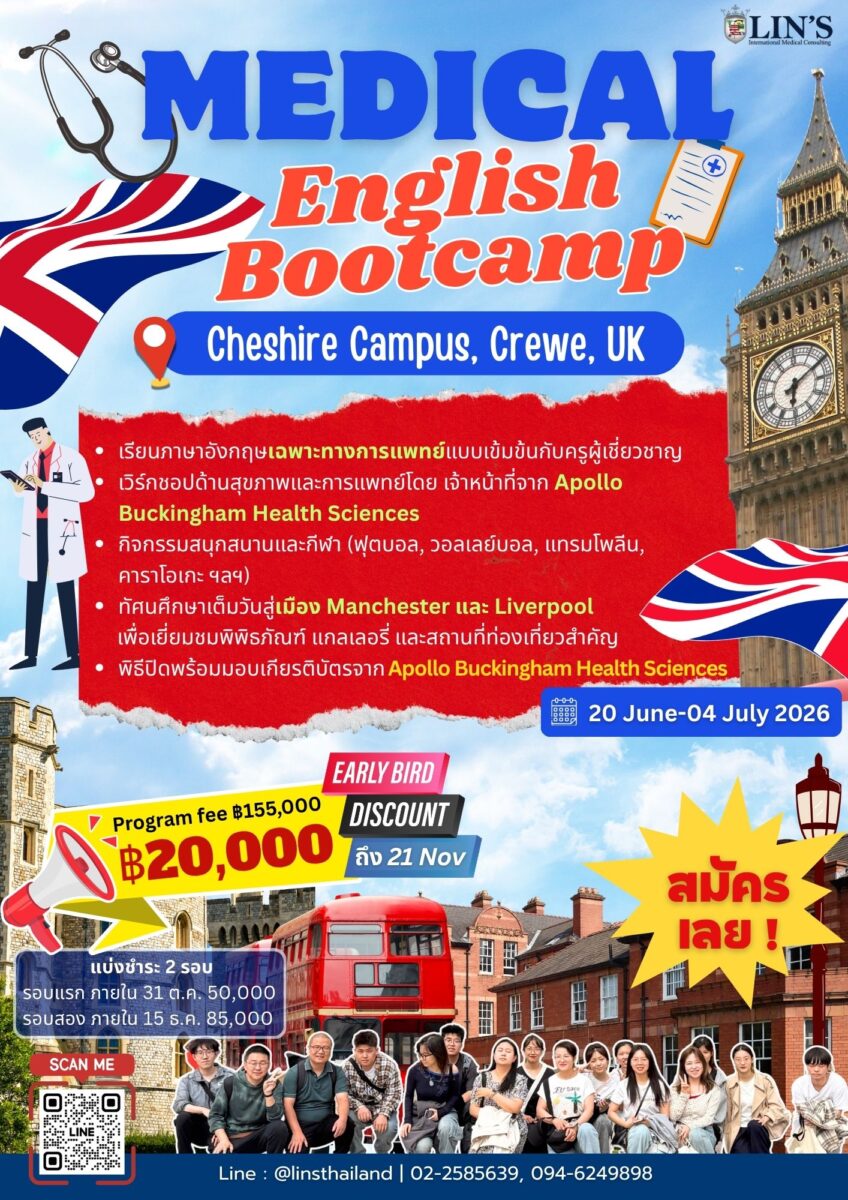 โปรแกรม Medical English Bootcamp ระยะเวลา 2 สัปดาห์ ออกแบบสำหรับนักเรียนที่สนใจด้านการแพทย์และต้องการพัฒนาภาษาอังกฤษ โดยมีการเรียนการสอนแบบเข้มข้น 21 ชั่วโมงต่อสัปดาห์ พร้อมเวิร์กชอปเสริมทักษะด้านการแพทย์และได้พัฒนาทักษะภาษาอังกฤษเฉพาะทางทางการแพทย์ และเรียนรู้ผ่านกิจกรรมเชิงปฏิบัติจริงในสภาพแวดล้อม Cheshire Campus ในอังกฤษ นอกจากนี้ยังมีโอกาสไปทัศนศึกษาในต่างเมืองและทำกิจกรรมสนุกสนานมากมาย
