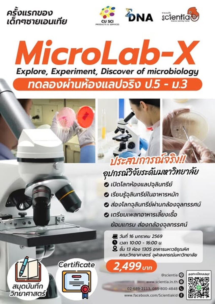 “MicroLab-X” คือประสบการณ์ที่เด็กๆ จะได้ก้าวจาก “ผู้เรียน” ไปเป็น นักวิทยาศาสตร์ตัวจริง เปิดโลกของสิ่งมีชีวิตขนาดเล็กที่ซ่อนอยู่ในอาหารรอบตัวเรา ตั้งแต่การเตรียมอาหารเลี้ยงเชื้อ การเพาะจุลินทรีย์ ไปจนถึงการส่องกล้องจุลทรรศน์ระดับวิจัย ใช้อุปกรณ์ระดับมหาวิทยาลัย 👩🔬🧫