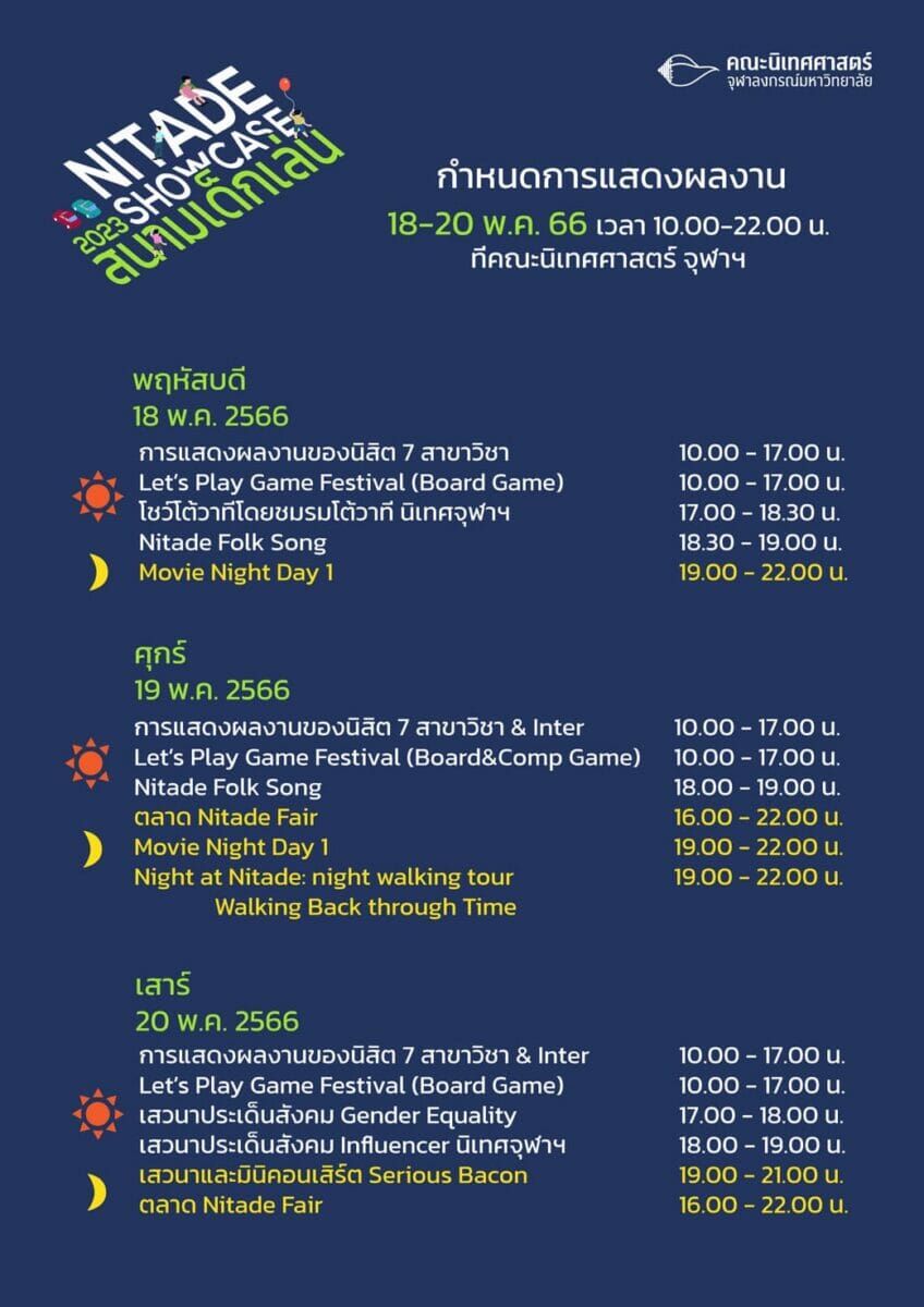 ทั้งกิจกรรมการแสดงผลงานของนิสิต 7 สาขาวิชา และหลักสูตรนานาชาติ กิจกรรมเสวนา มินิคอนเสิร์ต ‘Nitade Fair’ การออกร้านขายของโดยนิสิตและนิสิตเก่า และกิจกรรมไฮไลท์ Movie Night เนรมิตไต้ถุนให้เป็นโรงหนัง พร้อมด้วยกิจกรรม Night at Nitade ที่จะพาทุกคนไปสัมผัสประสบการณ์ย้อนอดีตบนตึกนิเทศจุฬาฯ แบบที่ไม่เคยมีใครเคยสัมผัสมาก่อน